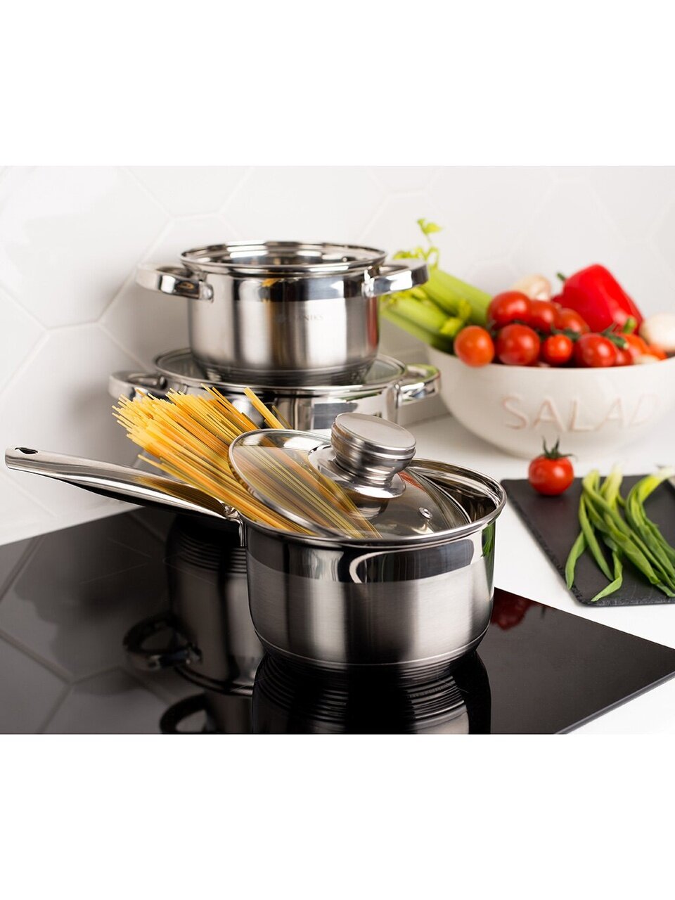 - Практичность: 3 кастрюли разного объёма (1.9, 2.9, 4.75 л) из прочной нержавеющей стали, стеклянные крышки для контроля процесса