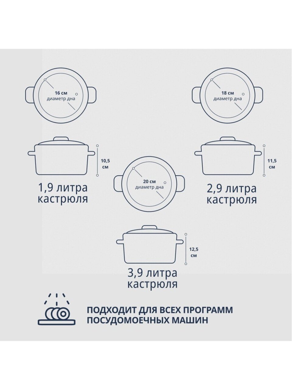- Универсальный набор: три кастрюли разного объема (1.9, 2.9, 3.9 л) с крышками — для готовки любых блюд