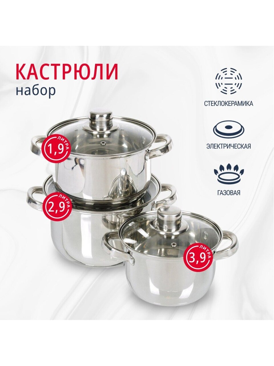 В комплекте три кастрюли объемом 1.9, 2.9 и 3.9 литра, каждая с отдельной стеклянной крышкой.