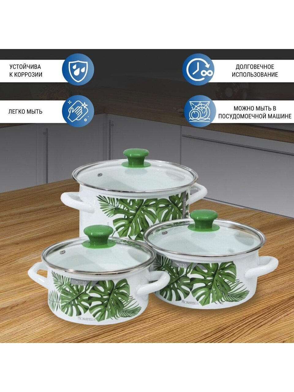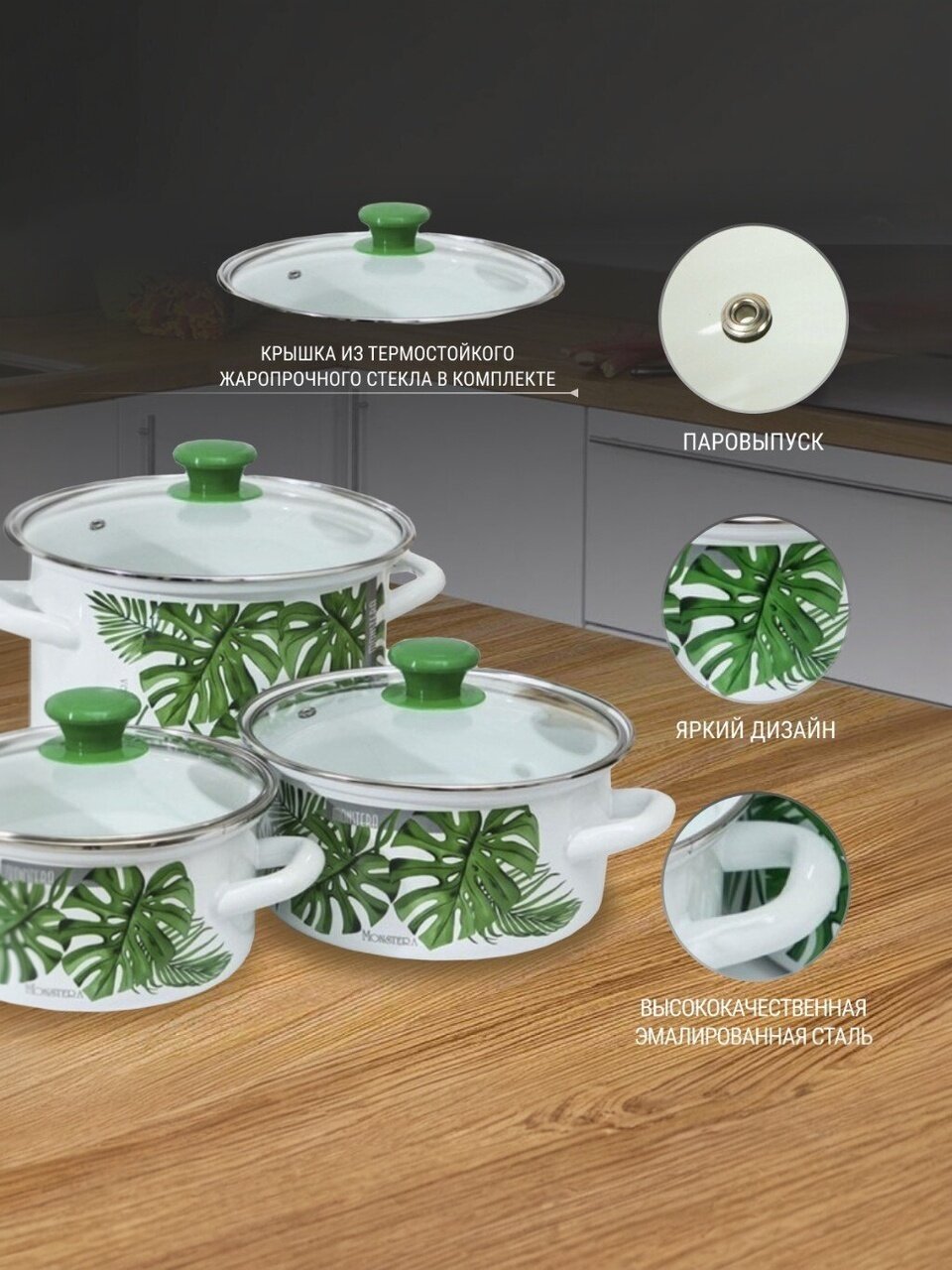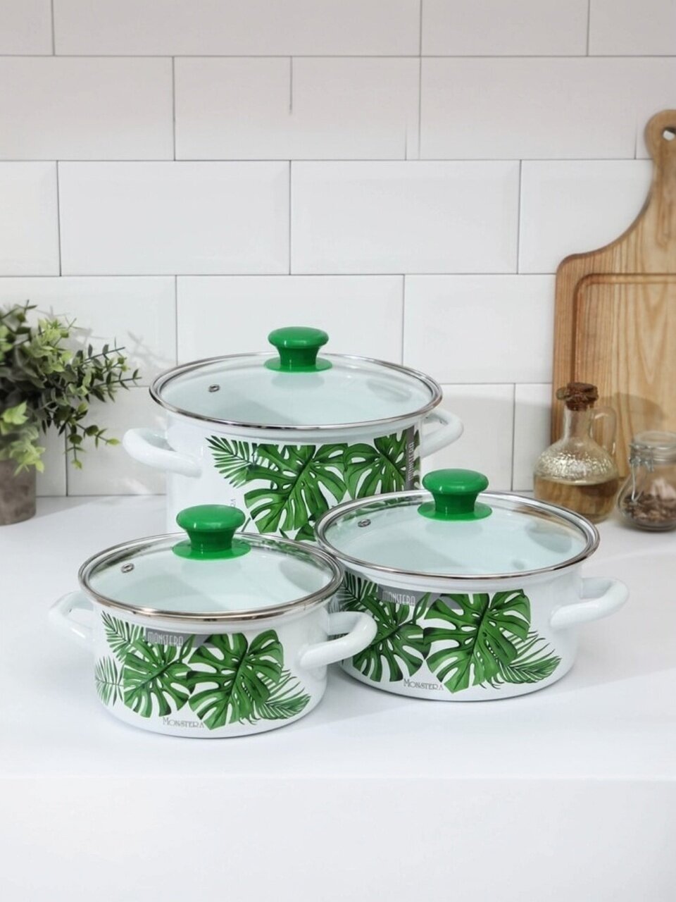 Набор кастрюль из эмалированной стали «Монстера-5-1-Экстра» — это сочетание прочности, экологичности и современного дизайна. Эмалированная сталь не выделяет вредных веществ, устойчива к коррозии и подходит для ежедневного использования. Благодаря стеклянным крышкам вы контролируете процесс приготовления без потери тепла. Если вы ищете, какую посуду выбрать для приготовления супов, каш, тушения овощей — этот набор оптимален для любых задач на кухне.