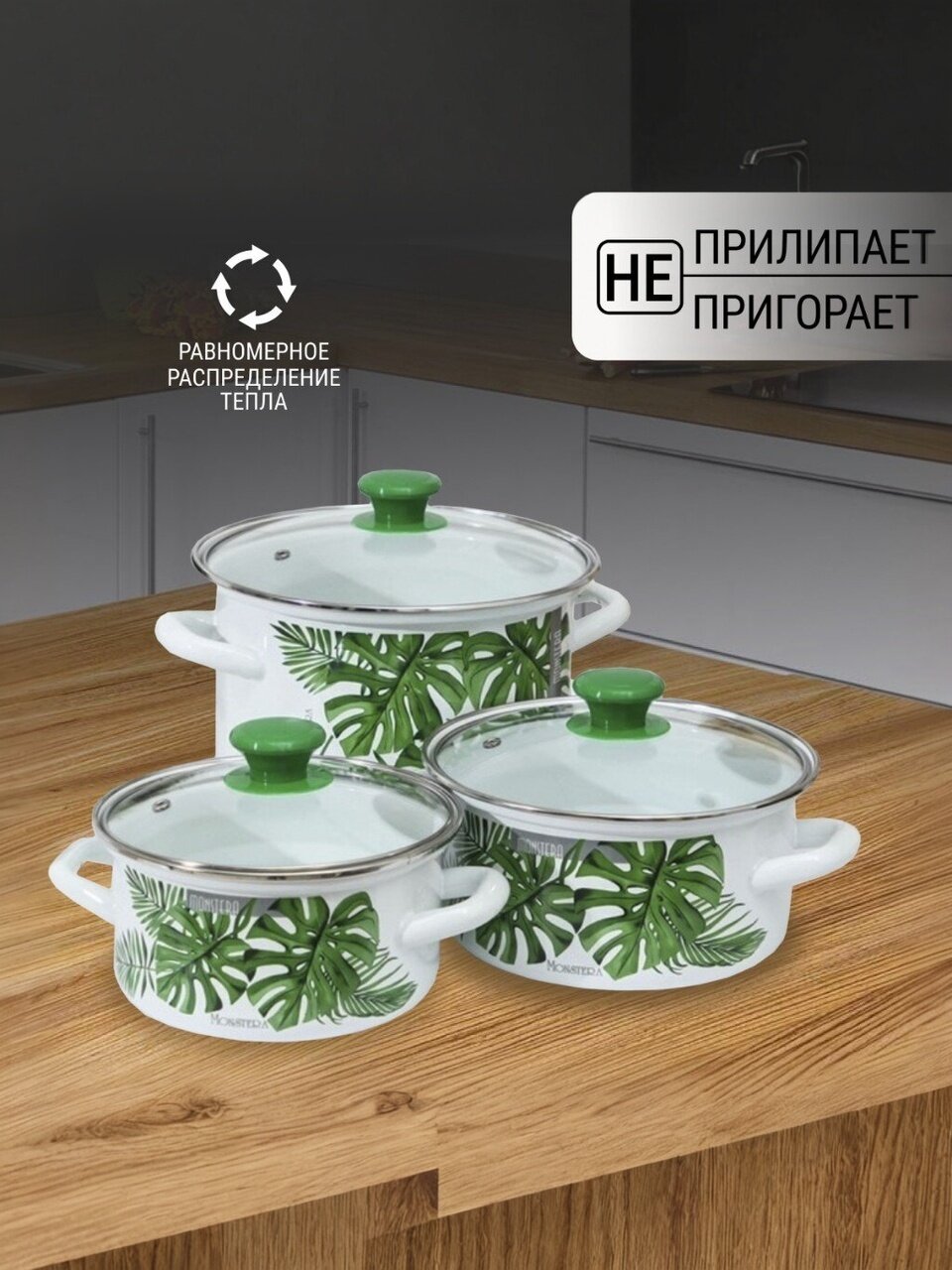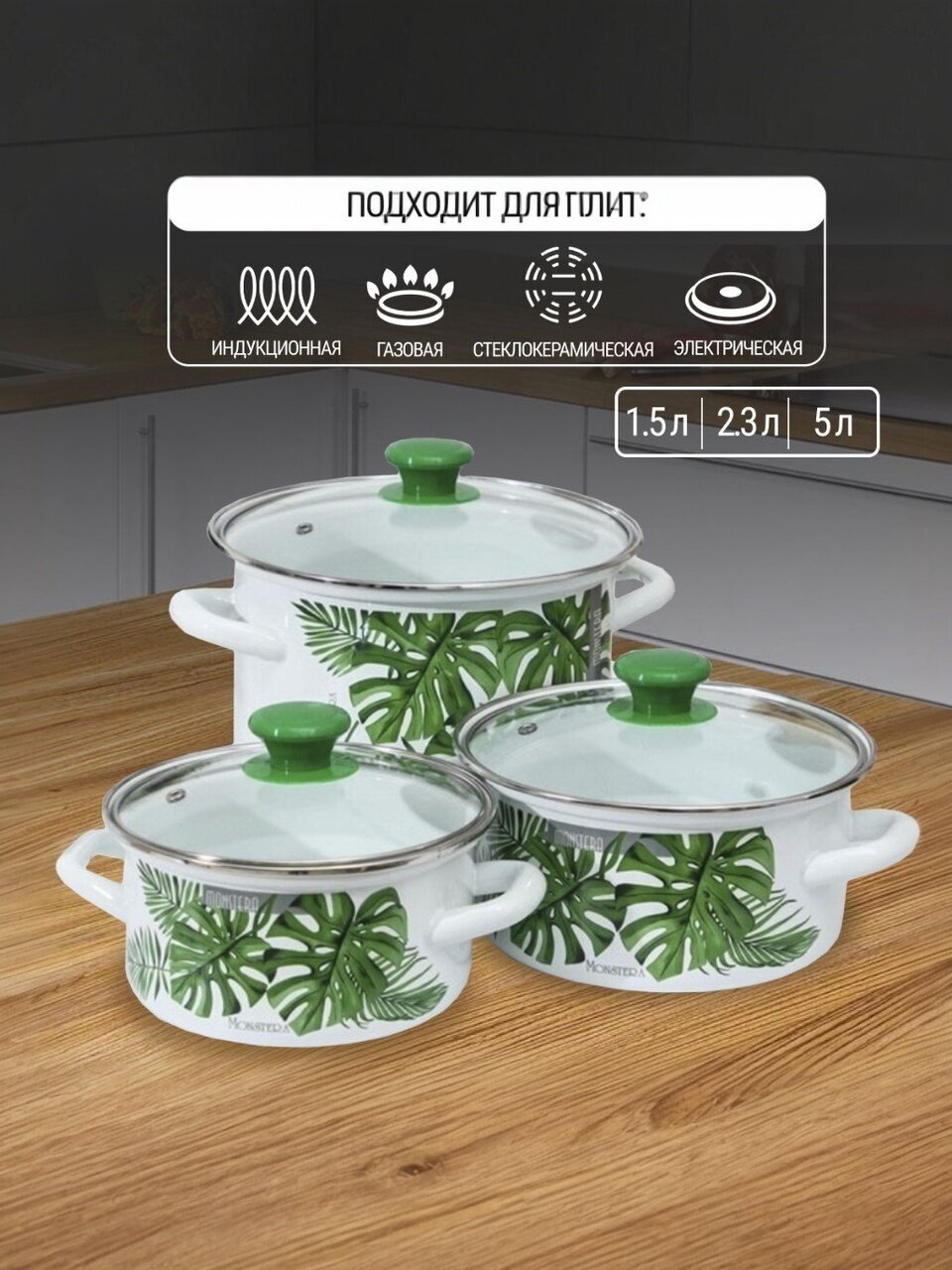 Вы можете приобрести «Набор посуды эмалированная сталь, 3 предмета, кастрюли 1.5, 2.3, 5 л, Керченский металлургический завод, Монстера-5-1-Экстра, белый» и другие товары в нашем интернет-магазине в Борисоглебске по низким ценам и с бесплатным самовывозом.