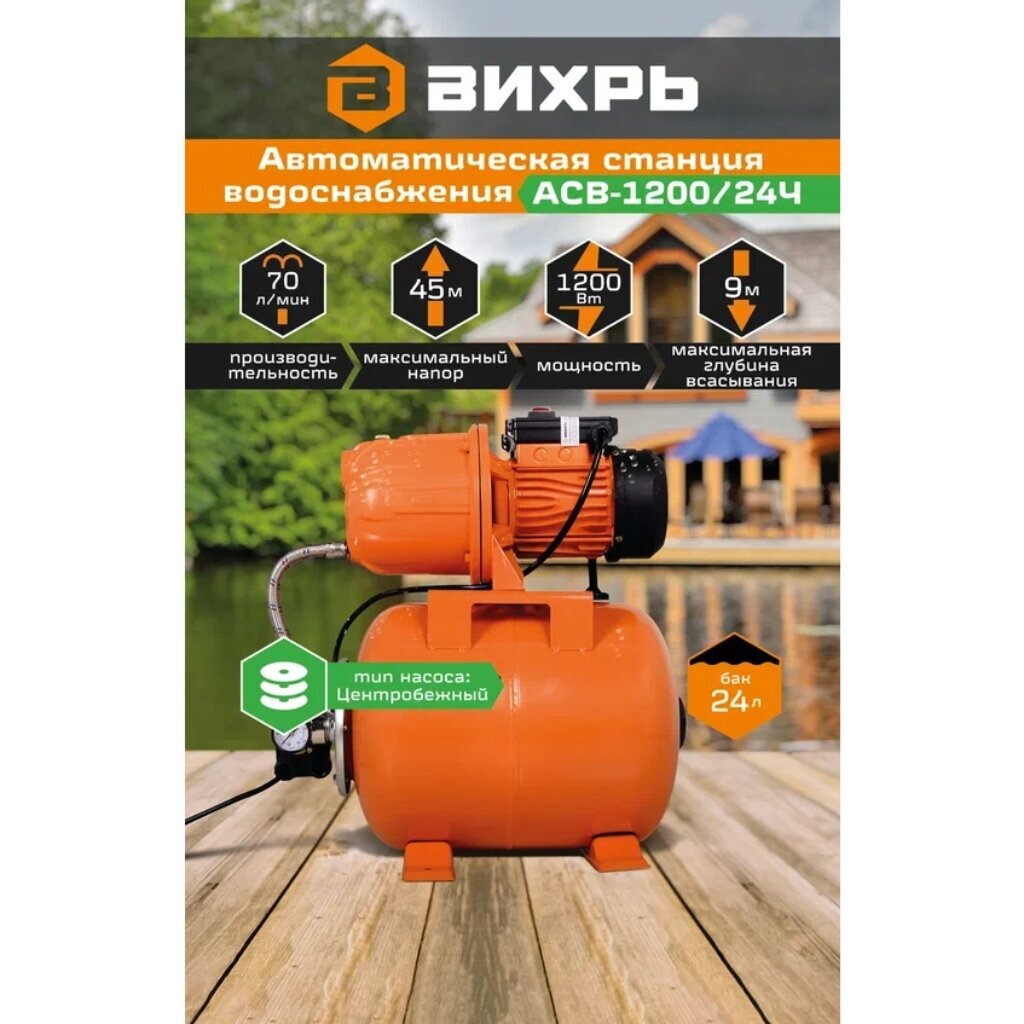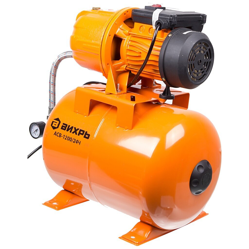 Электродвигатель насосной станции ВИХРЬ АСВ-1200/24Ч асинхронный, однофазный с короткозамкнутым ротором. Насос со встроенным эжектором сочетает преимущества центробежных с практичностью самовсасывающих насосов. Гидроаккумулятор агрегата служит для аккумулирования воды под давлением и сглаживания гидроударов. Он состоит из стального резервуара со сменной мембраной и имеет пневмоклапан для закачивания сжатого воздуха.