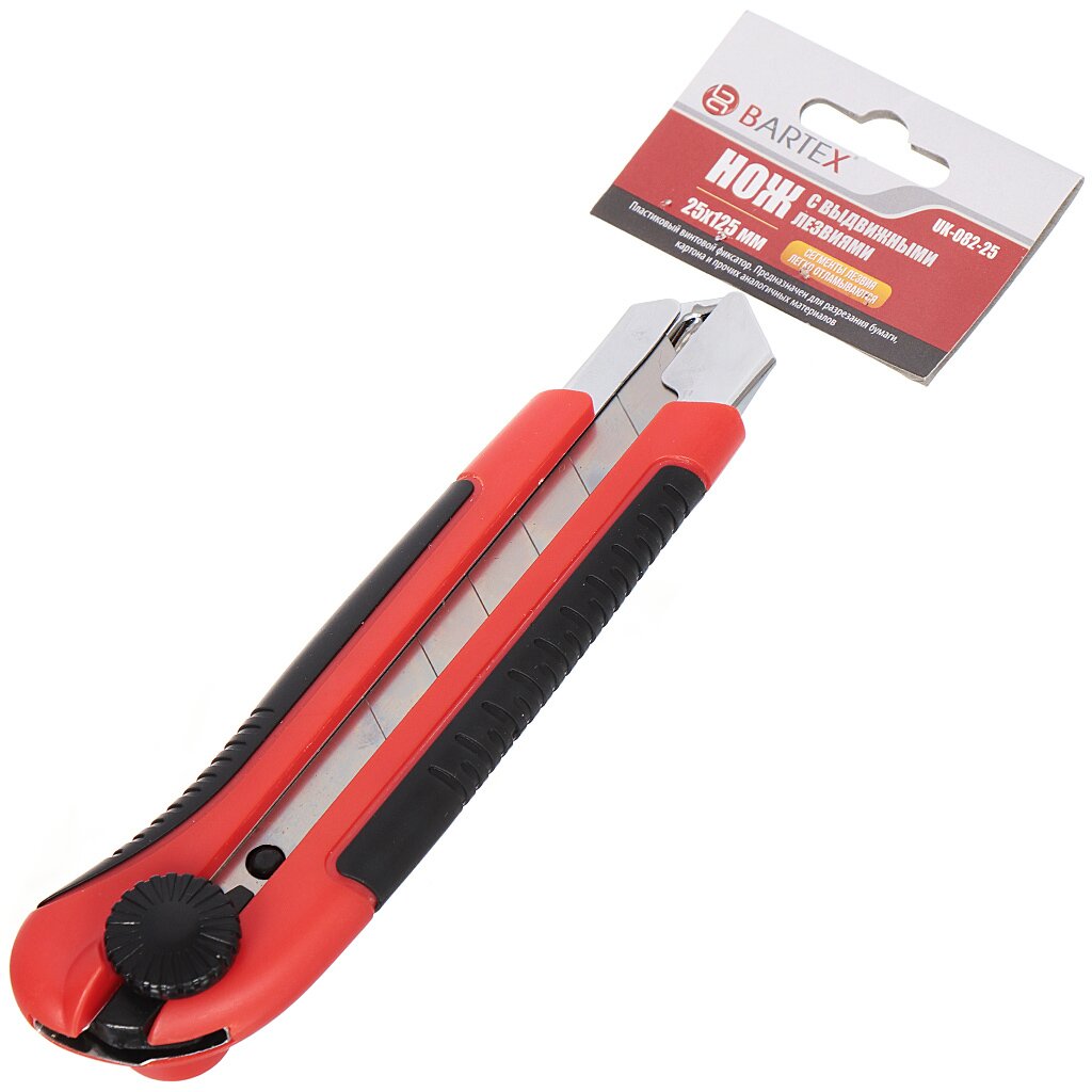 Вы можете приобрести «Нож строительный, пластик, обрезиненный, выдвижное лезвие, 25х125 мм, фиксатор, металлическая направляющая, Bartex, UK-82-25» и другие товары в нашем интернет-магазине в Смоленске по низким ценам и с бесплатным самовывозом.
