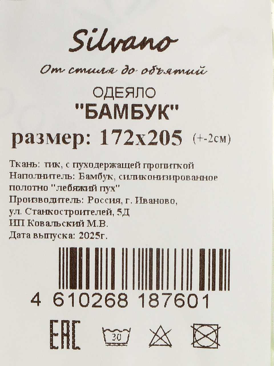 Одеяло Silvano имеет размер 172х205 см — это стандарт для двуспальных кроватей, подходит для большинства постельных комплектов и обеспечивает комфортное укрытие на двоих.