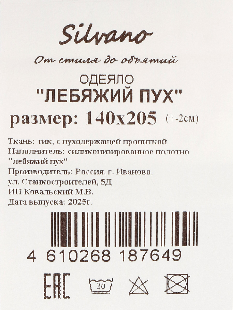 Одеяло 1.5-спальное Silvano с наполнителем из искусственного лебяжьего пуха — это практичный выбор для тех, кто ищет недорогое, теплое и при этом легкое одеяло для повседневного использования. Благодаря плотности 350 г/м2 изделие сохраняет тепло, но не перегревает даже в межсезонье, что особенно важно для комфортного сна. Чехол из тика и хлопка приятен к телу, не вызывает раздражения и легко стирается в машинке — отличный вариант для аллергиков и семей с детьми.