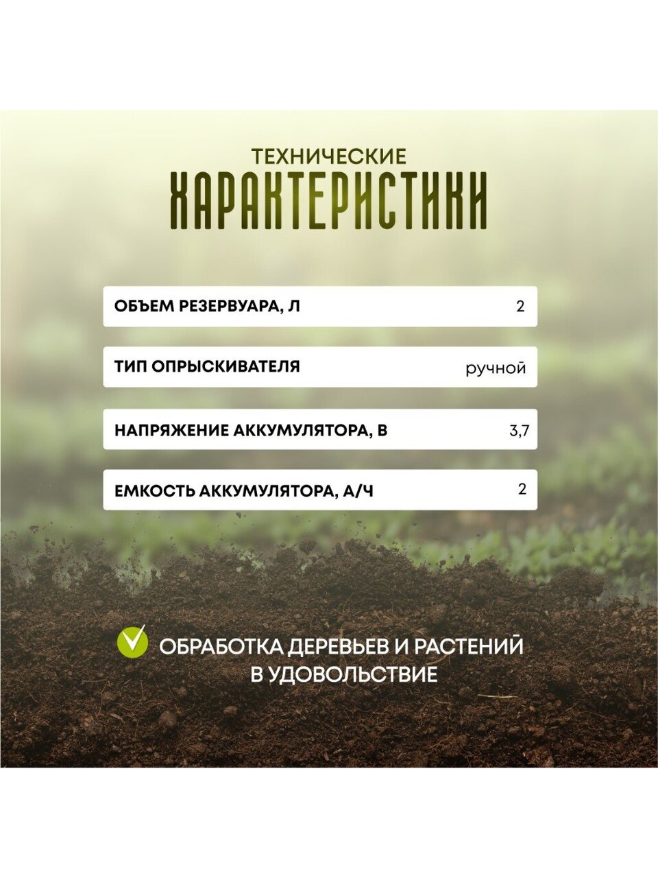 Опрыскиватель можно использовать в любом месте без необходимости подключения к электрической сети. Это особенно удобно для обработки удаленных участков сада или огорода, где нет доступа к розеткам.