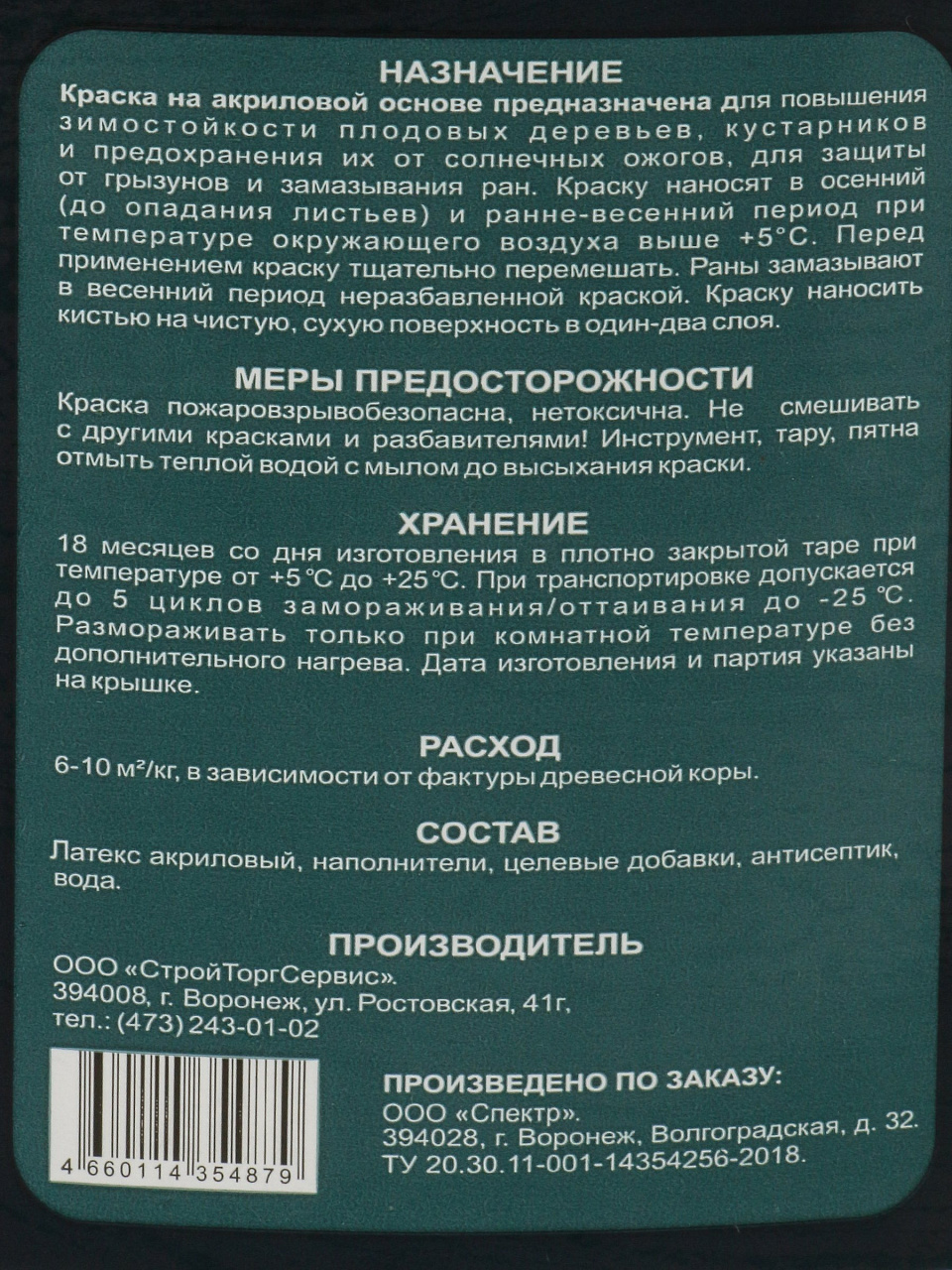Краска на акриловой основе предназначена для повышения зимостойкости плодовых деревьев, кустарников и предохранения их от солнечных ожогов, для защиты от грызунов и замазывания ран. Она хорошо переносит влагу и не смывается после высыхания, устойчива к перепадам температур, сохраняет свои свойства при воздействии УФ-лучей. Сохраняет свежий вид в течение длительного времени и не требует частой перекраски.