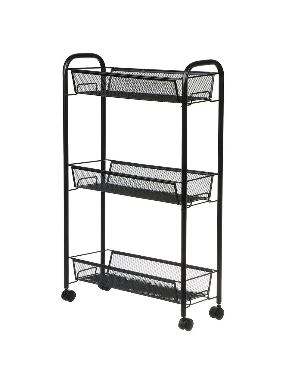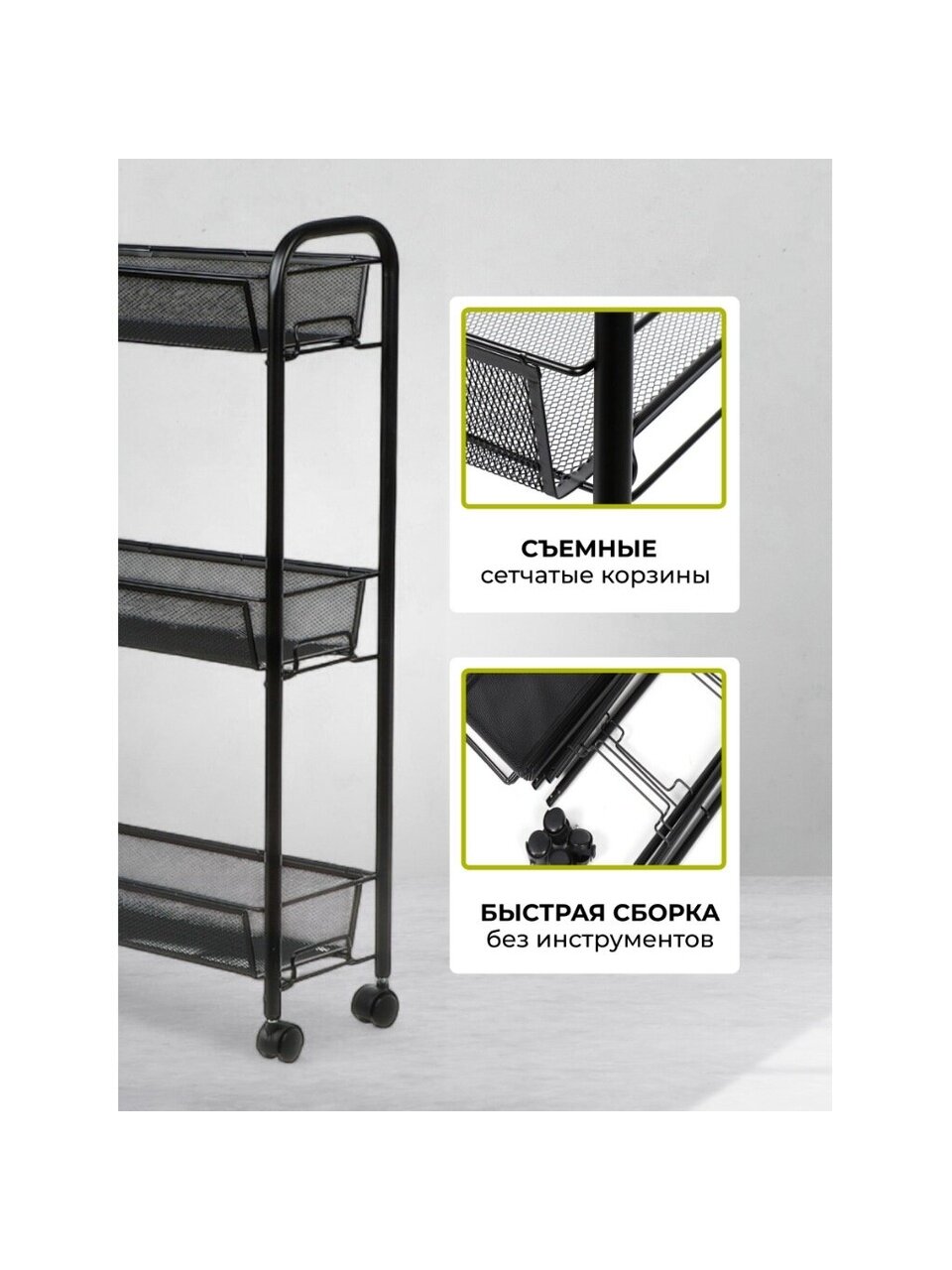 Этажерка универсальная, сталь, 3 секции, 44х17х70.5 см, на колесах, с мелкосетчатыми корзинами, черная, LD01-748-7 — идеальное решение для тех, кто ценит порядок и стиль в интерьере. Этот практичный и современный предмет мебели станет не только функциональным дополнением любого помещения, но и стильным акцентом, который подчеркнет ваш безупречный вкус. Полки можно менять местами между собой, но регулировка по высоте не предусмотрена. Расстояние между дном одной полки и другой составляет 27 см.
