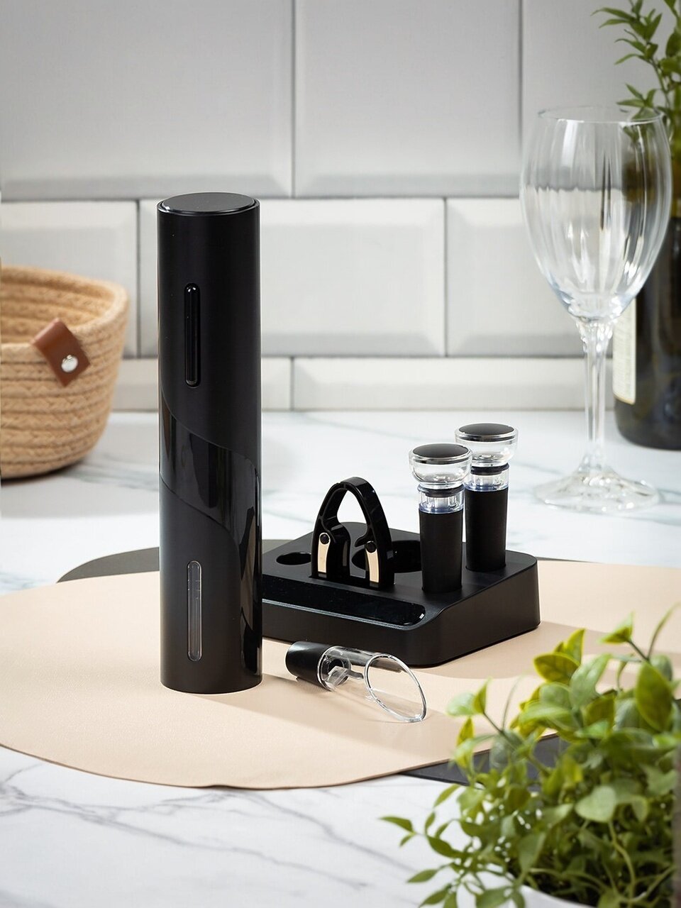 - пять предметов в комплекте: все необходимое для полного винного ритуала;