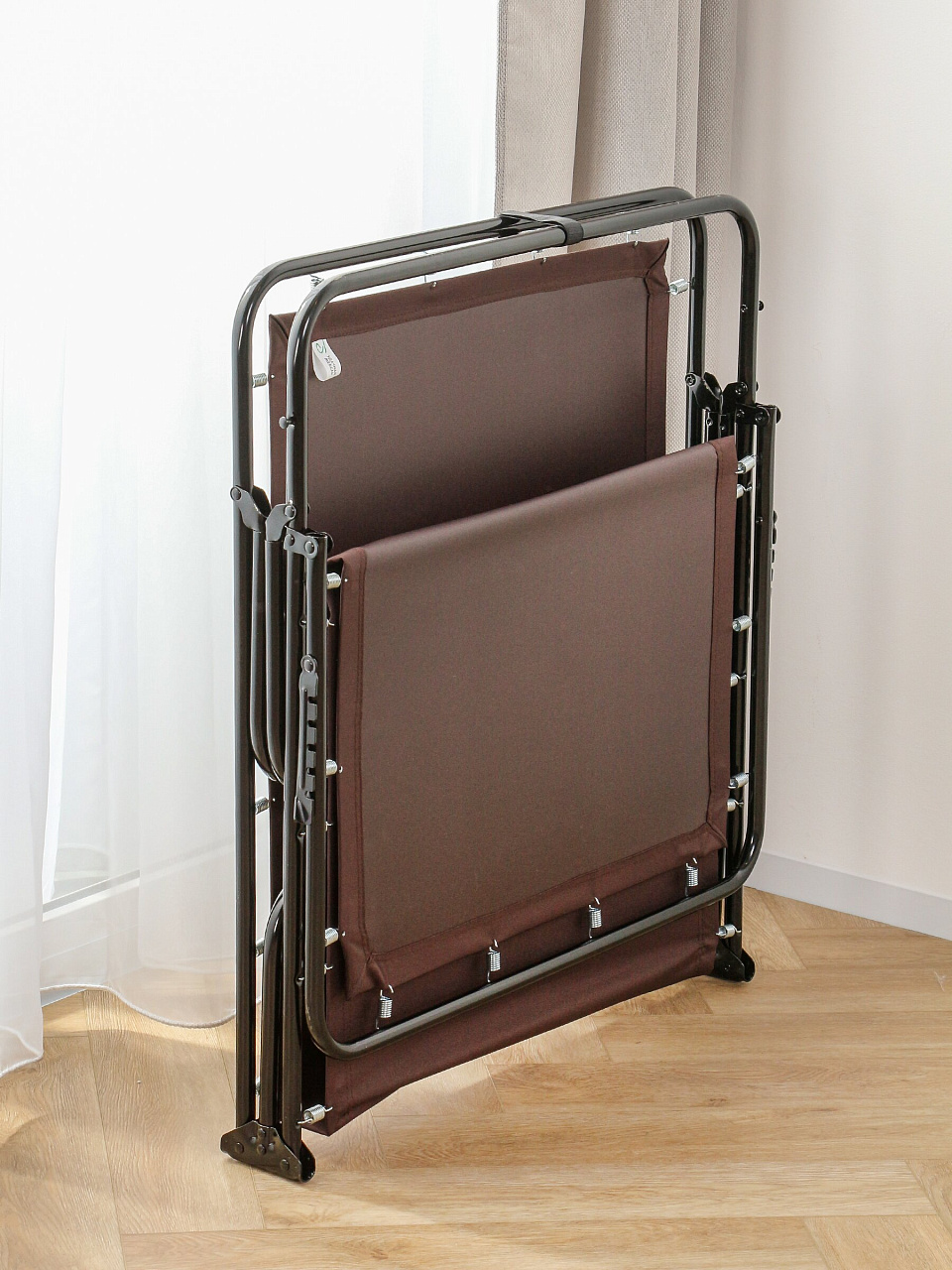 Этот вариант отлично подойдет для организации дополнительного спального места на даче или дома, когда внезапно приехали гости. Раскладушку удобно хранить и перевозить, в сложенном виде.