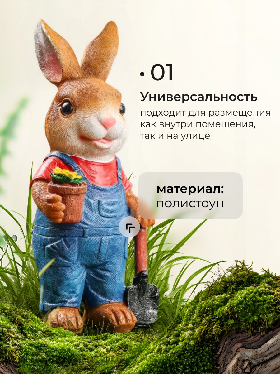 Фигурка Кролик добавит радость и удовольствие в повседневную жизнь, создавая уютную и приятную атмосферу в саду. Она может вызывать положительные эмоции и ассоциироваться с приятными моментами, что делает ее не только красивым элементом экстерьера, но и источником радости и вдохновения.