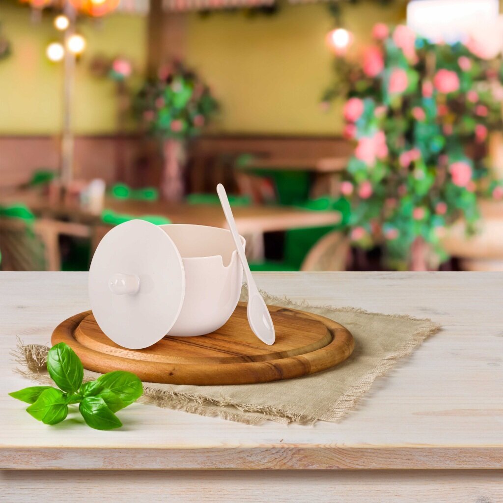Сахарница изготовлена из прочного пластика, что гарантирует ее надежность и долговечность.