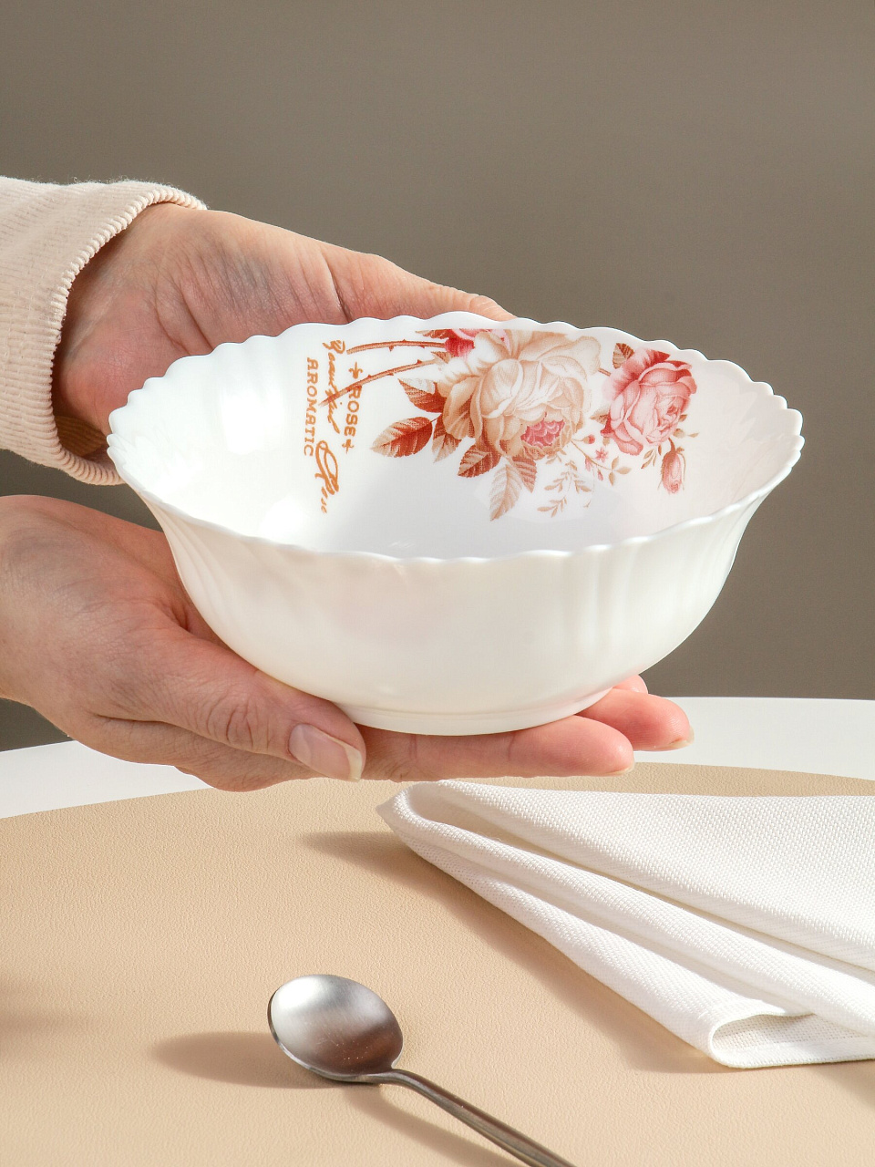 Диаметр салатника — 15 см, объём — 0.44 л. Это оптимальный размер для индивидуальной подачи, в том числе для детей.