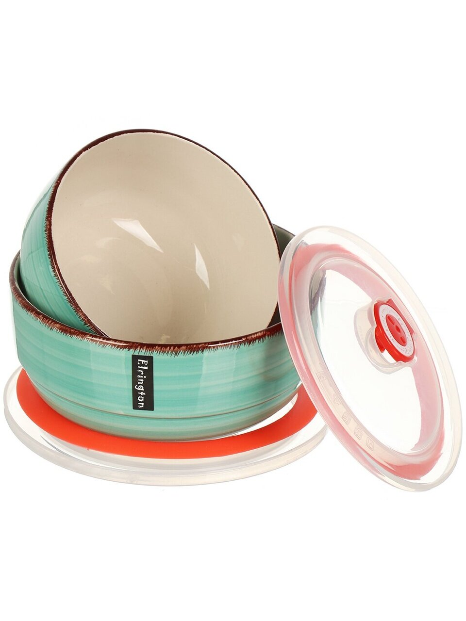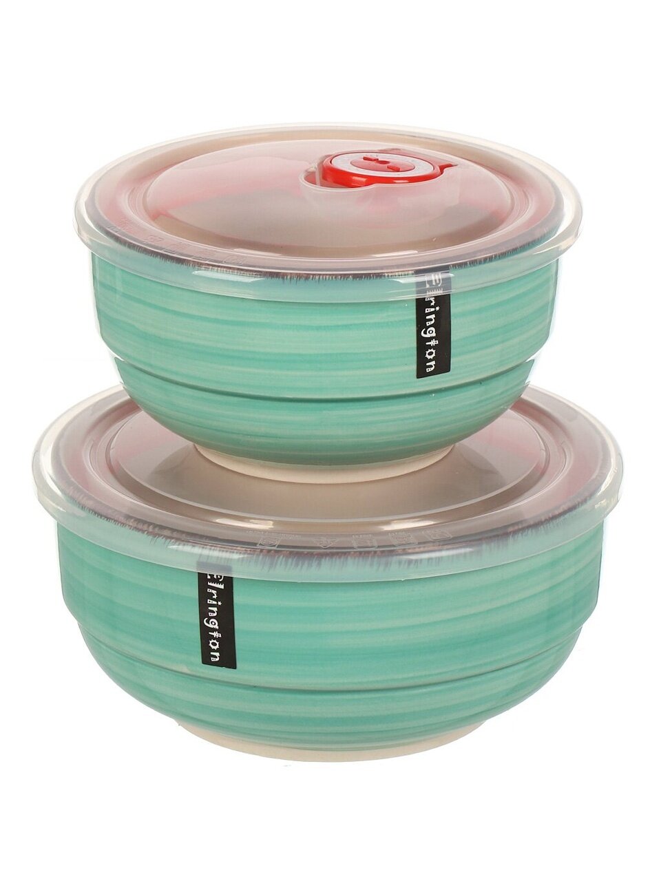 Салатники Elrington 139-23109: набор из 2 керамических мисок с крышками, стиль «Аэрограф, Изумруд», 0.45 и 0.8 л — практичное решение для хранения и сервировки.