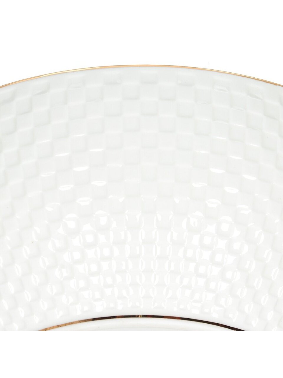 Диаметр — 18 см, высота — 7 см, вес — 0.45 кг. Круглая форма, рельефный узор, цвет белый с золотой окантовкой.
