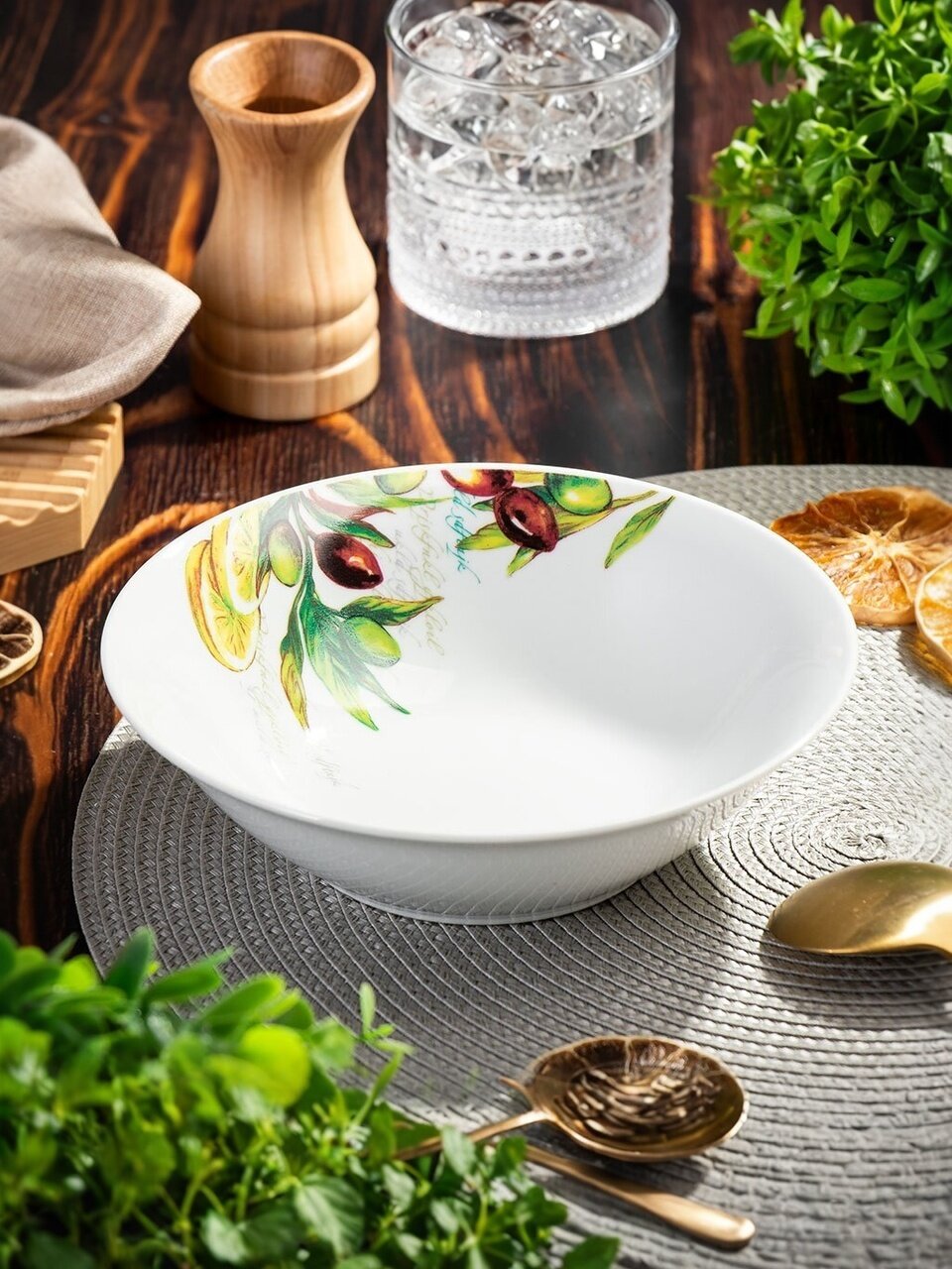 Если вы ищете, чем отличается этот салатник от аналогов, обратите внимание на сочетание цены и дизайна: рисунок с оливами добавляет индивидуальности, а белый цвет подчёркивает свежесть сервируемых блюд.