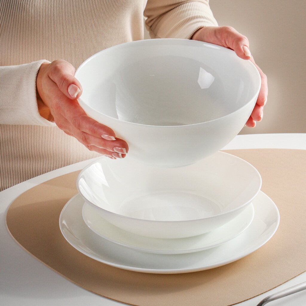 - Практичный комплект: 4 десертные, 4 обеденные, 4 суповые тарелки и салатник — всё для полноценного приёма пищи