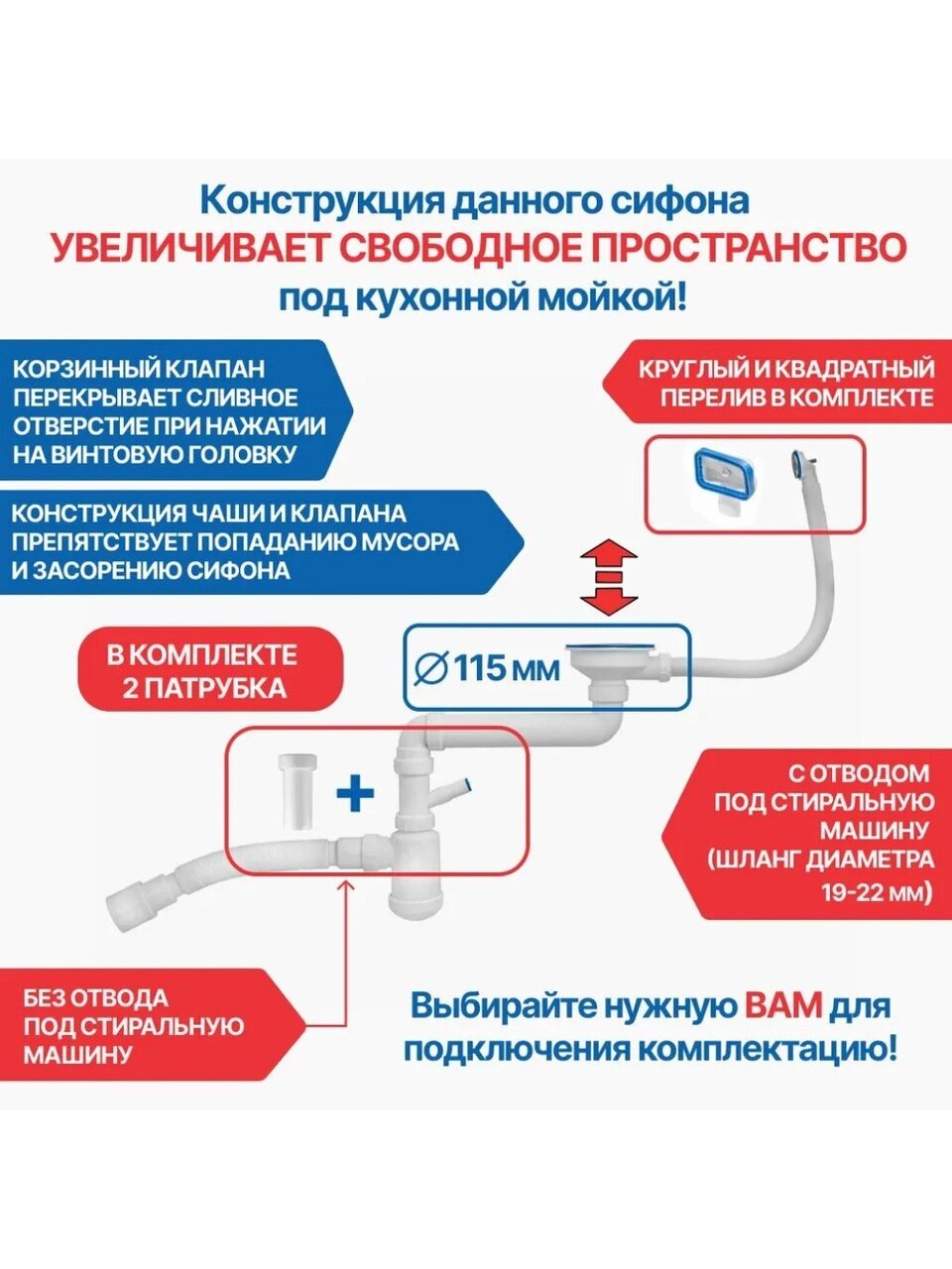 Правильно подобранный сифон обеспечивает отличный слив и помогает избежать частого засорения канализации. Модель MasterProf ИС.110639 устанавливается на кухонные мойки со сливным отверстием 90-94 мм. В комплекте 2 патрубка с отводом под стиральную машину и без, что делает сифон универсальным, позволяя выбрать нужную для подключения комплектацию. Конструкция данного сифона увеличивает свободное пространство под кухонной мойкой. Подходит для моек с максимальной глубиной сливного отверстия 30 мм.