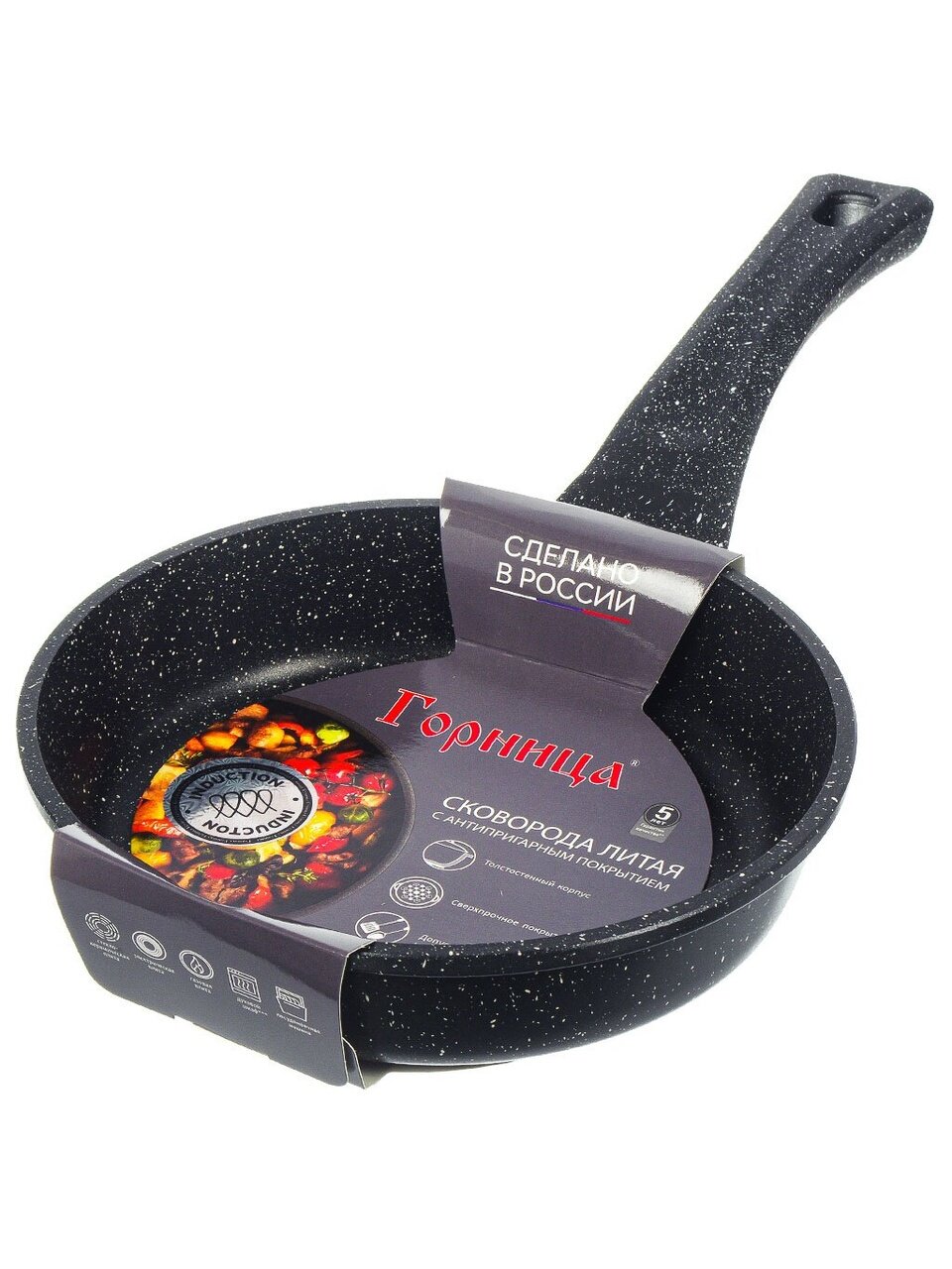 Литая сковорода Горница Гранит Induction 20 см — универсальное решение для индукционных и любых плит. Толстое дно 6 мм, мраморное антипригарное покрытие, 5 лет гарантии.