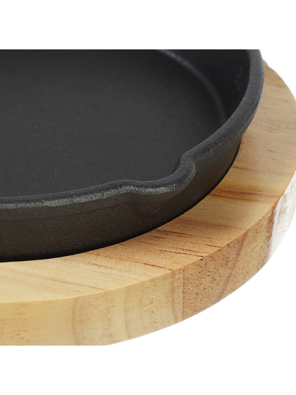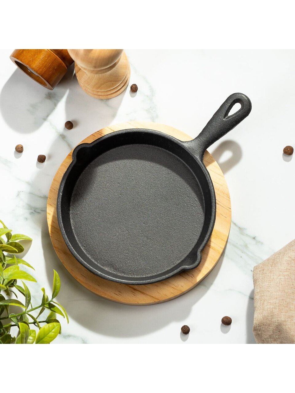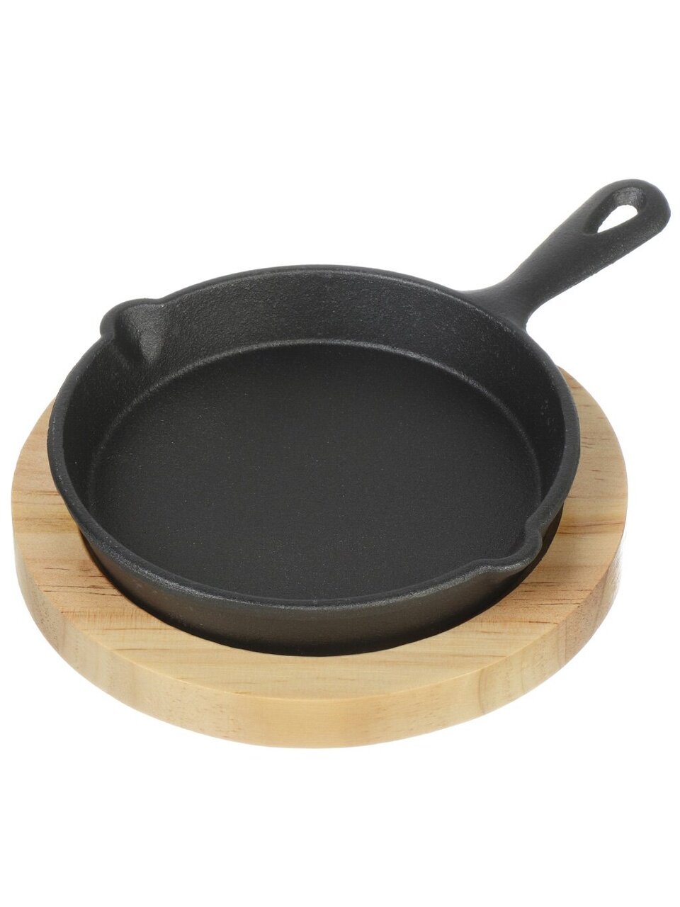 - Уникальное сочетание: компактная чугунная сковорода с подставкой из бамбука — удобно для сервировки и подачи прямо на стол