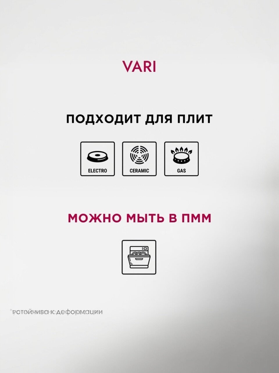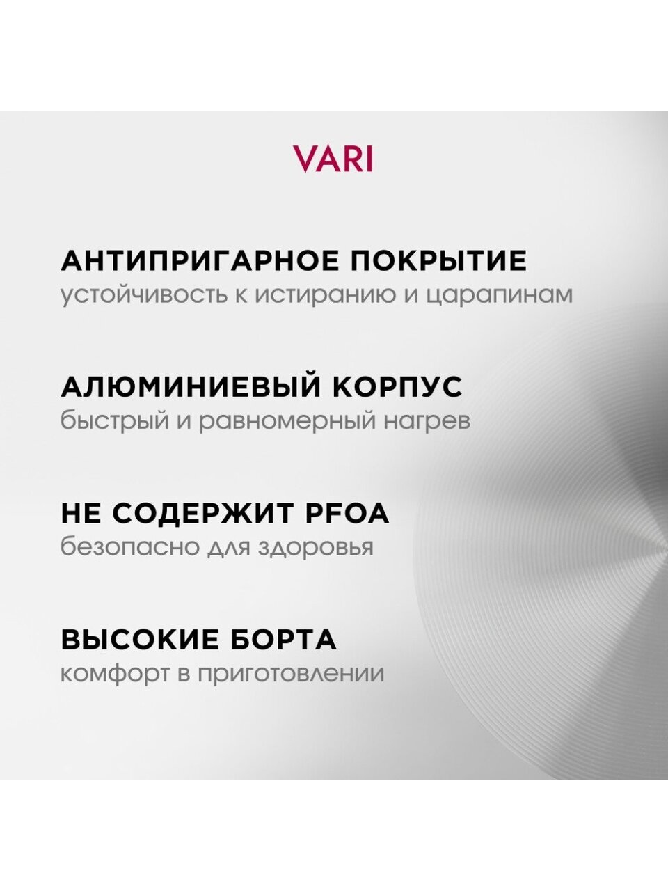 Если вы ищете, чем отличается литая алюминиевая сковорода от обычной, обратите внимание: литой алюминий обеспечивает более равномерный нагрев по сравнению с штампованными аналогами, а керамическое покрытие экологично и безопасно. Сковорода Vari Fresco Ceramica легко моется в посудомоечной машине, не требует специальных средств и не впитывает запахи. Не подходит для индукционных плит — это важно учесть при выборе.