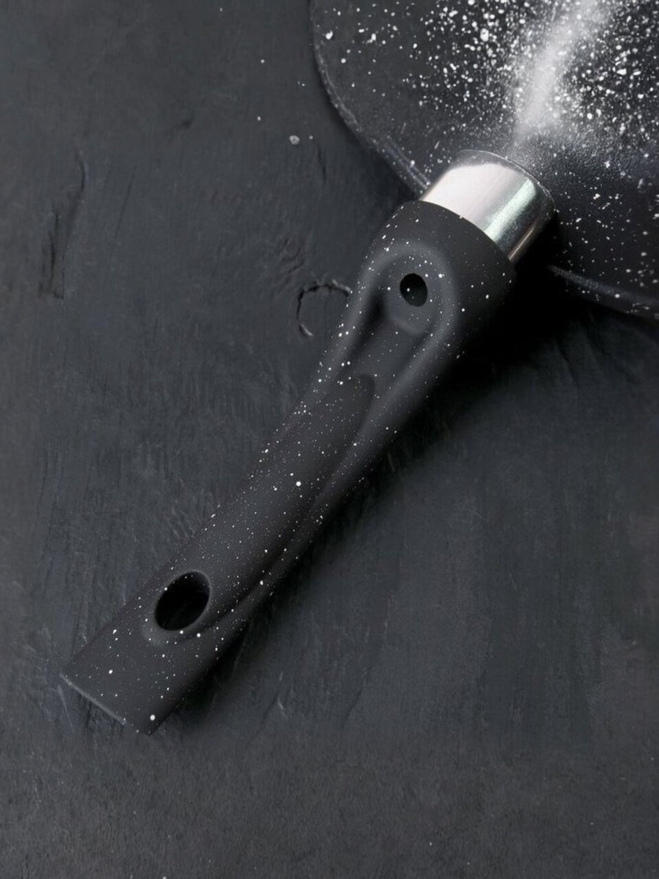 Мраморное антипригарное покрытие устойчиво к царапинам, легко моется, не требует большого количества масла — пища не пригорает, а сковорода служит дольше.