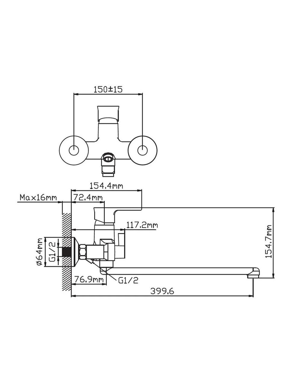 Смеситель устанавливается вертикально на стену, требуется 2 монтажных отверстия с межосевым расстоянием 150 мм. Крепление — гайка, стандарт подводки 1/2".