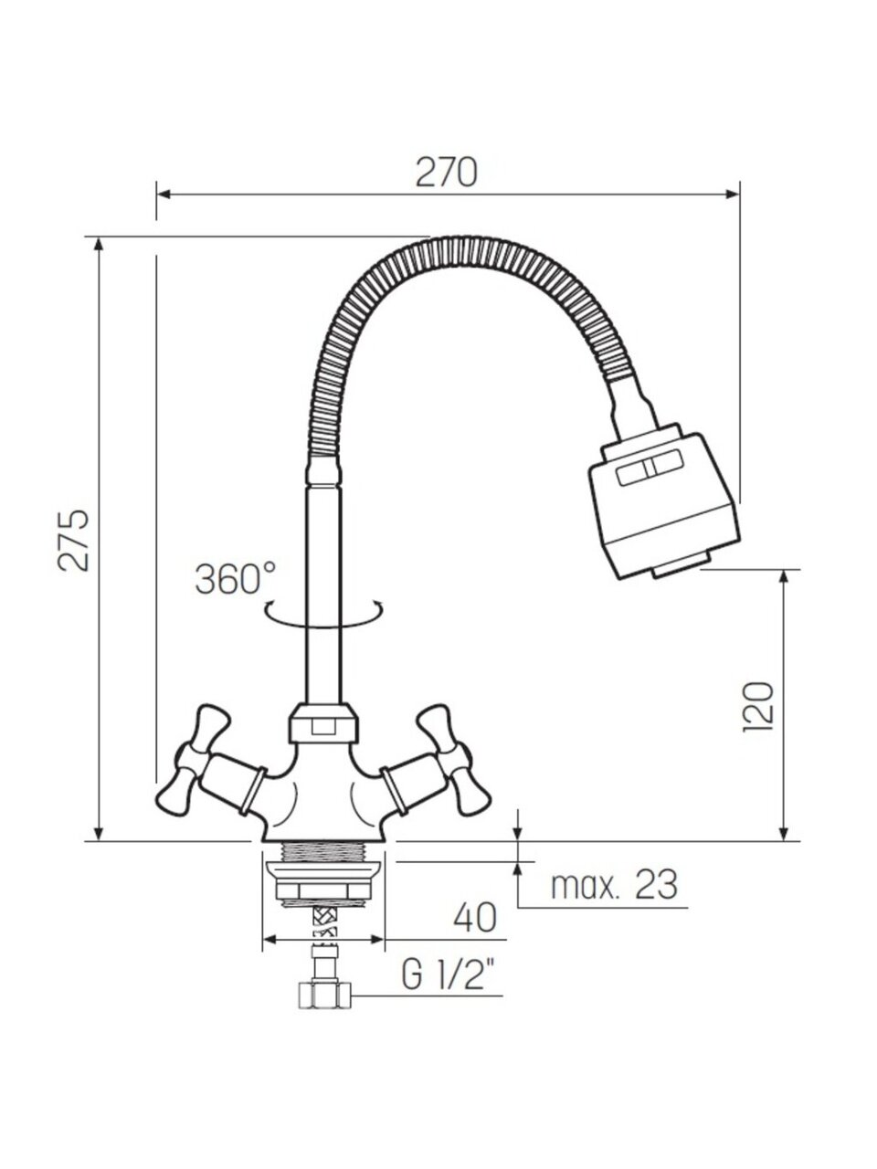 Излив гибкий, длина 27 см, высота 12 см. Высокий, подходит для глубокой мойки и напора воды в разных направлениях.