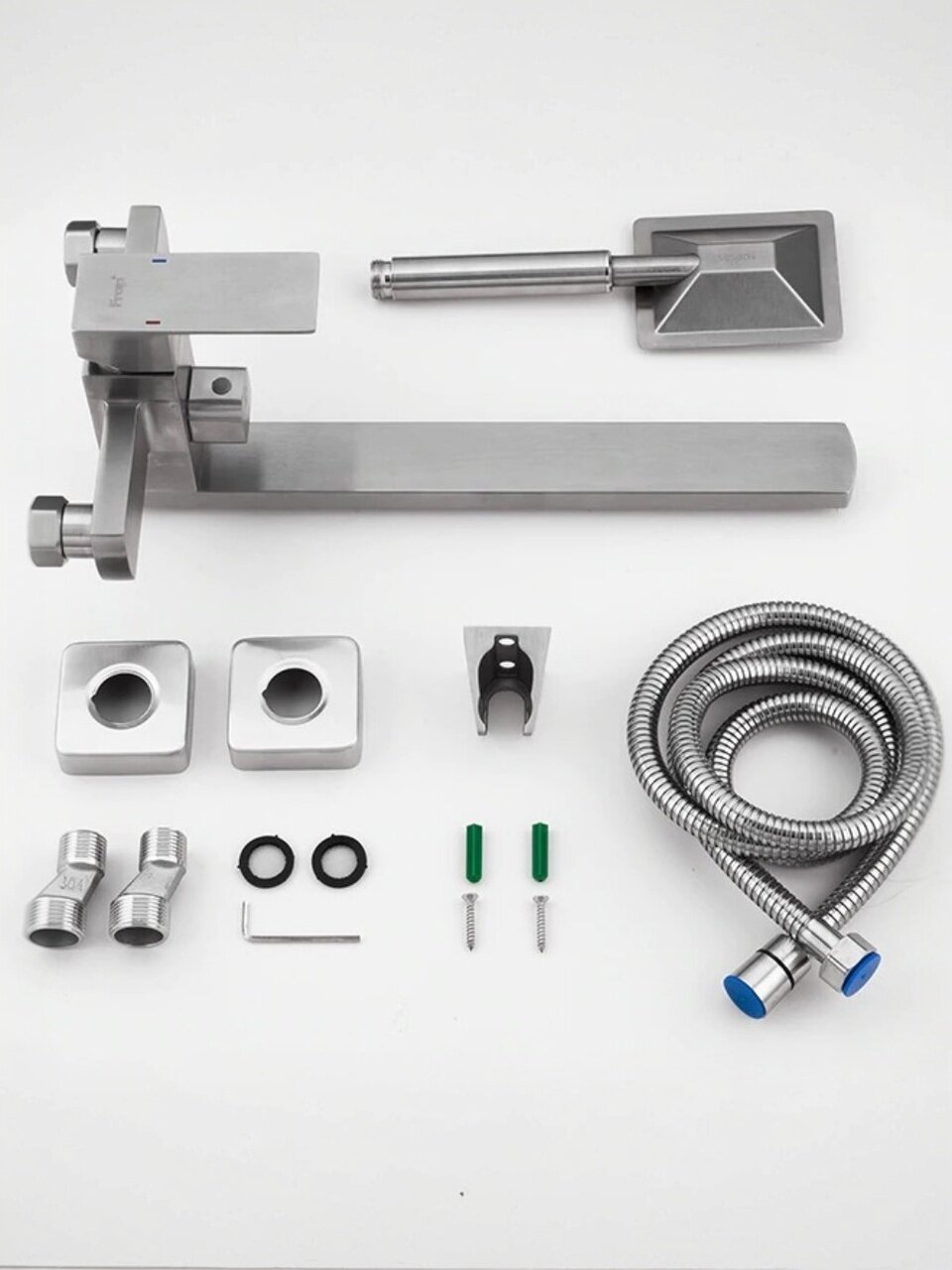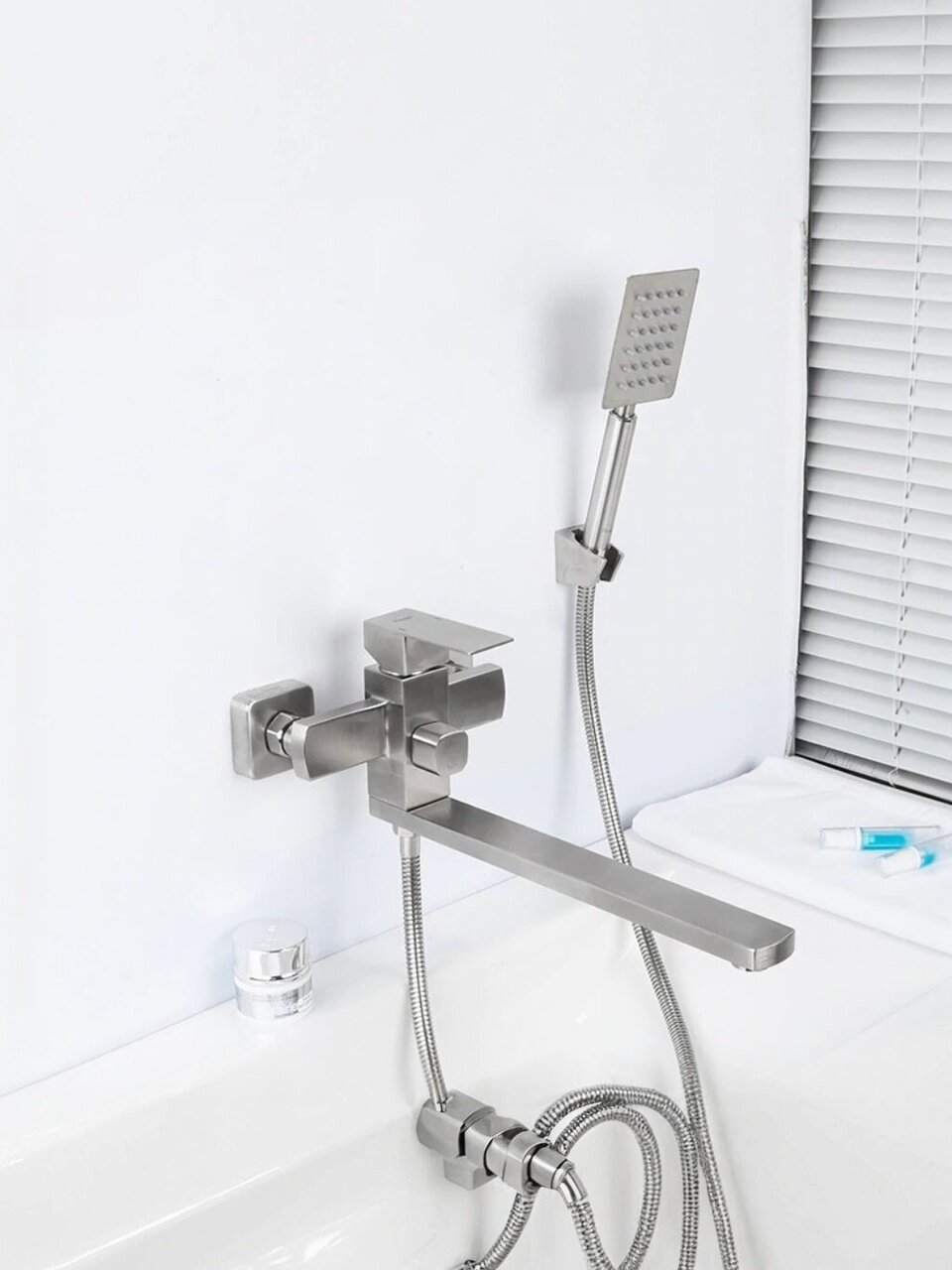 Смеситель для ванны Frap F22802 — надежная нержавеющая сталь, керамический картридж, современный стиль для дома и дачи. Длина излива 35 см, лейка в комплекте.