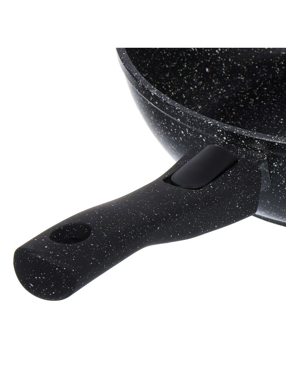 Сотейник Горница Гранит — это глубокая литая сковорода с округлым дном. Благодаря такой форме ингредиенты на протяжении процесса приготовления опускаются в центр и хорошо прогреваются. Дополнительный слой с мраморным эффектом увеличивает износостойкость и создаёт оригинальный оттенок чёрного мрамора.