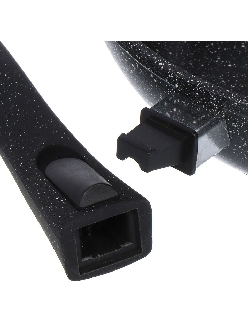 - Съёмная ручка расширяет функционал и позволяет использовать посуду в духовом шкафу. Ручка софт тач не нагревается на плите и не выскальзывает из рук.