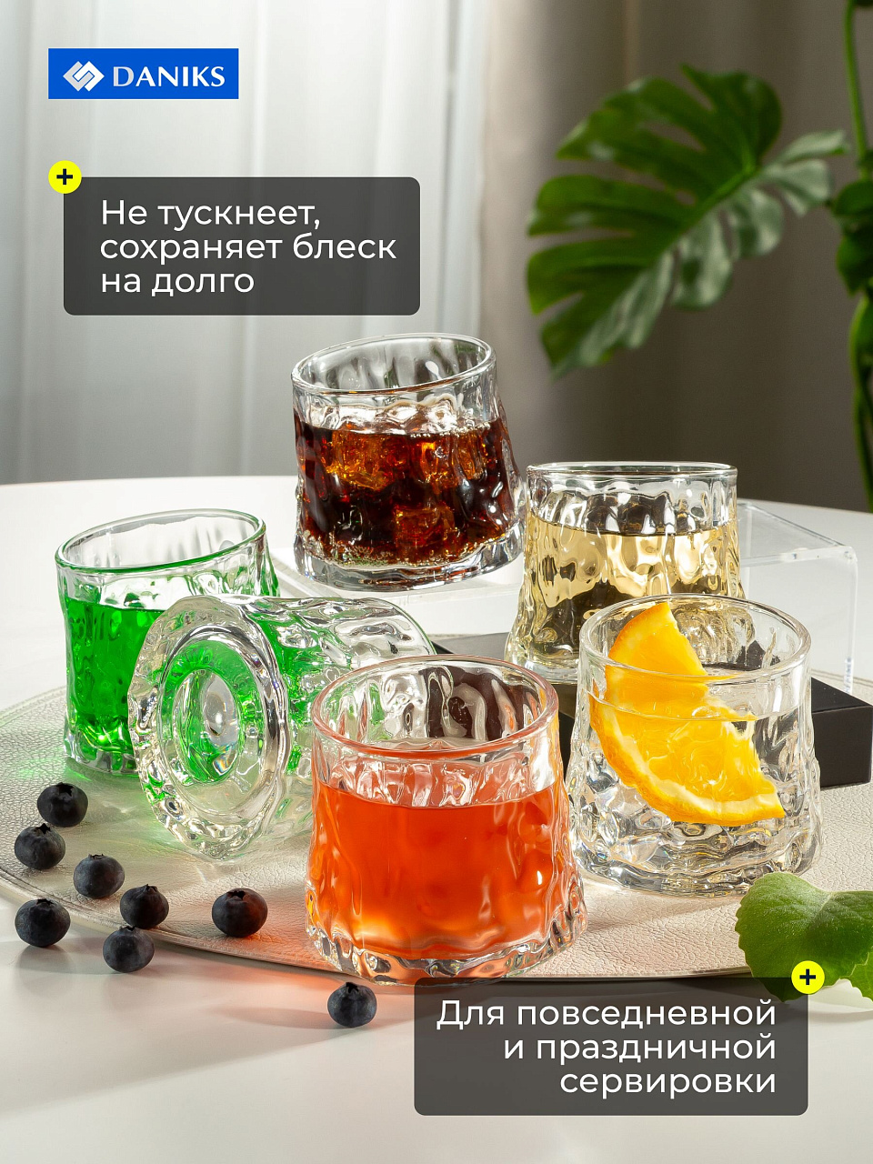 Часто спрашивают: "Как выбрать стаканы для воды и виски?" — обратите внимание на материал и форму. В отличие от аналогов из пластика или тонкого стекла, эти стаканы Daniks устойчивы к царапинам, не мутнеют со временем, не впитывают запахи. Можно мыть в посудомоечной машине, что экономит время. Для дачи, дома или подарка — это практичный и эстетичный выбор.
