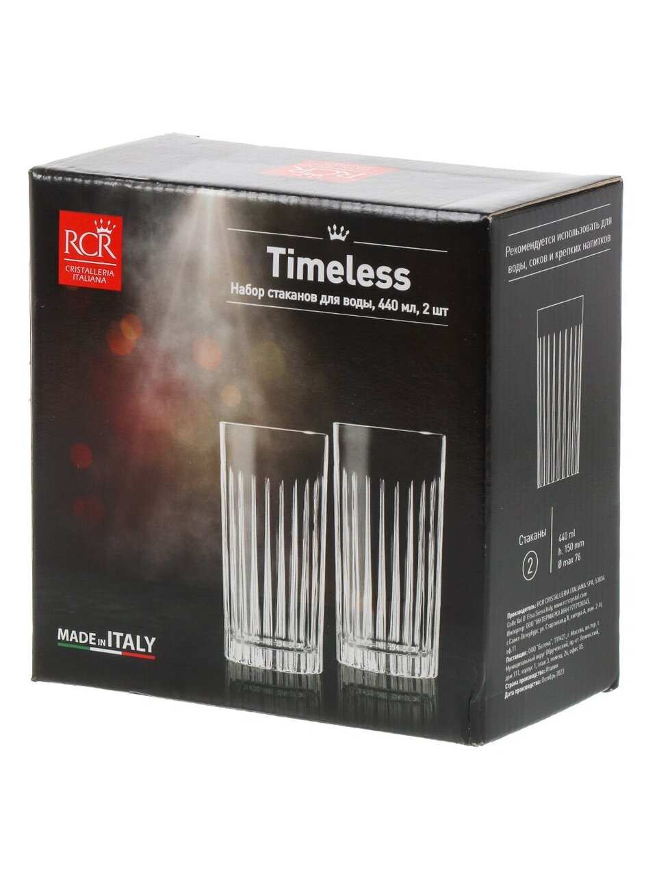Стаканы RCR Timeless 440 мл — идеальный набор из 2 хрустальных бокалов для стильной сервировки воды и коктейлей. Прочность, универсальность, итальянский дизайн.