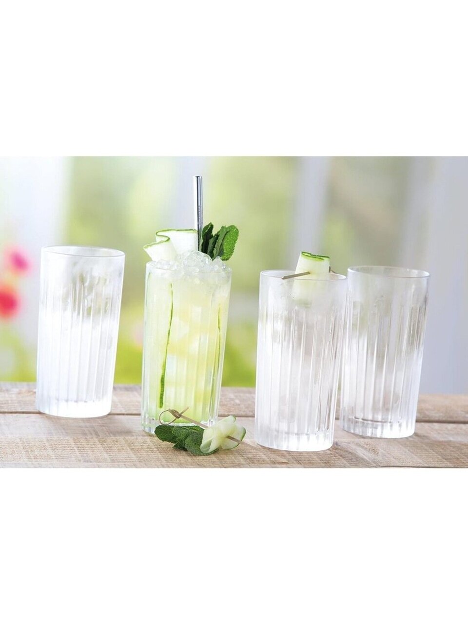 Объем каждого стакана — 440 мл, форма — высокий и узкий хайбол, что удобно для воды, коктейлей и лимонадов.