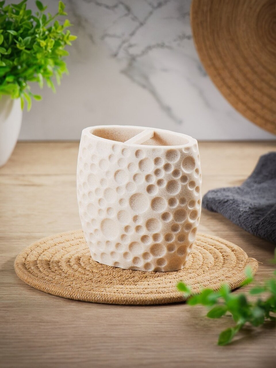 Выбирая этот стакан для зубных щеток, покупатель получает не только аксессуар для хранения, но и элемент декора, который добавит изюминку в интерьер ванной комнаты. Полистоун, из которого изготовлено изделие, обеспечивает долговечность, а стильный дизайн и приятный бежевый оттенок делают его идеальным выбором для создания уютной и современной атмосферы. Этот аксессуар станет отличным дополнением к любому интерьеру, добавляя нотку элегантности и утонченности.