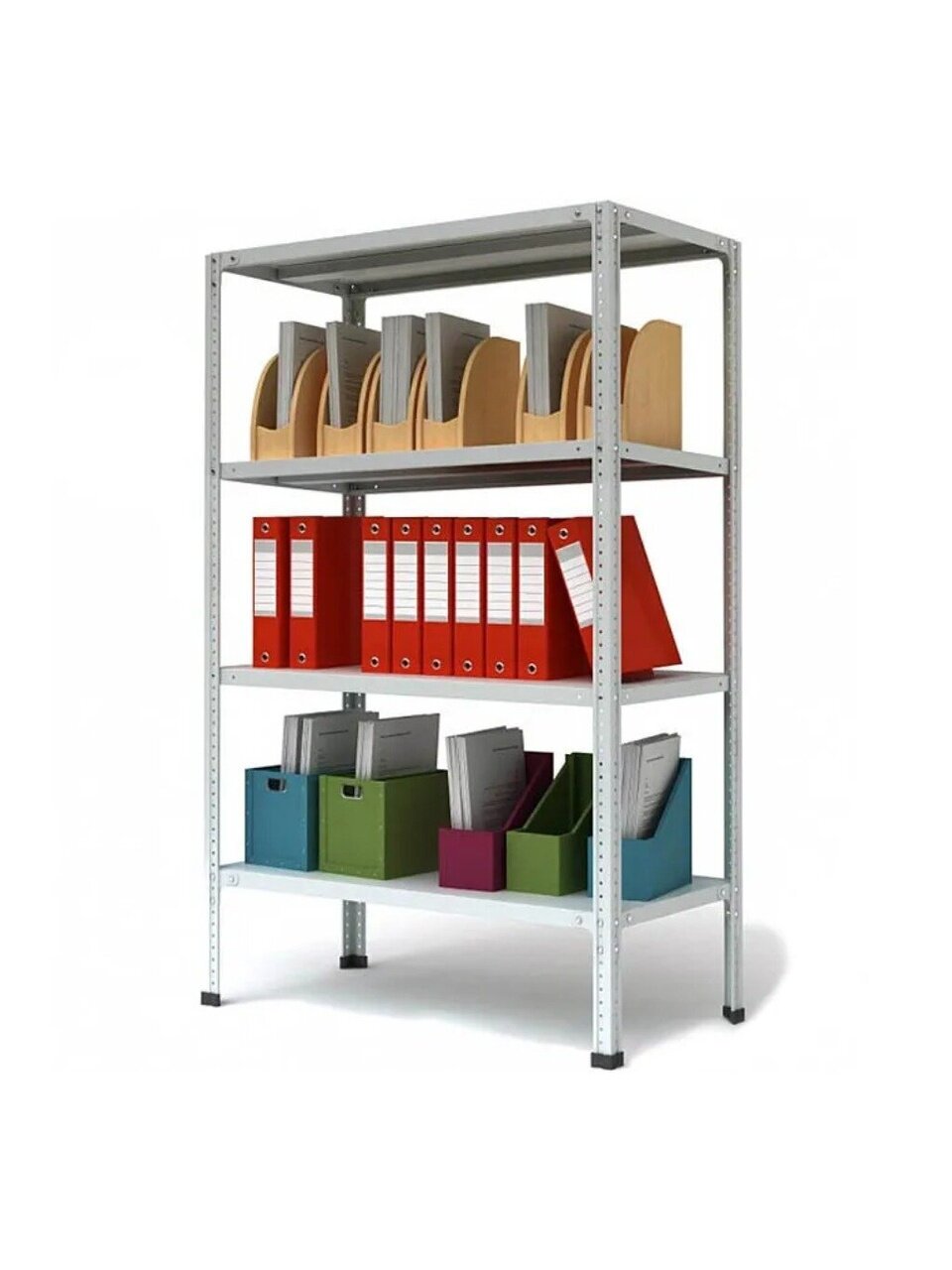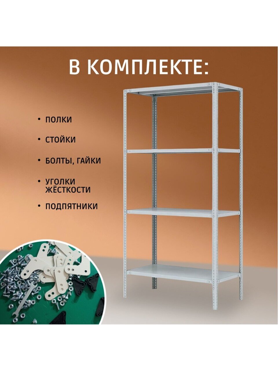 Стеллаж поставляется в разобранном виде и укомплектован 4-мя металлическими стойками, 4-мя металлическими полками и необходимым крепежом для сборки.