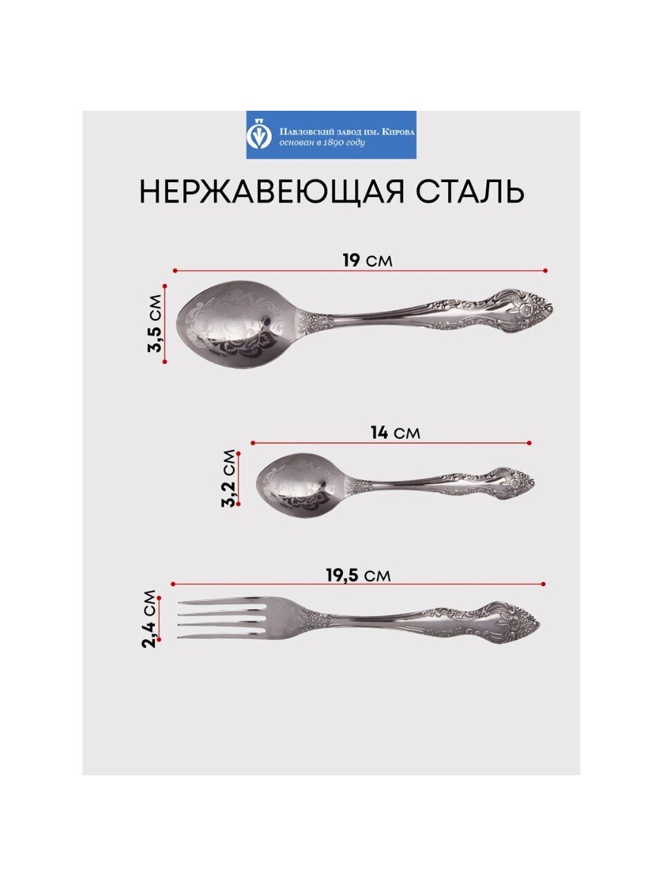 Длина каждого прибора — 19,5 см, ручки металлические, фигурные, что обеспечивает удобство и стильный внешний вид.