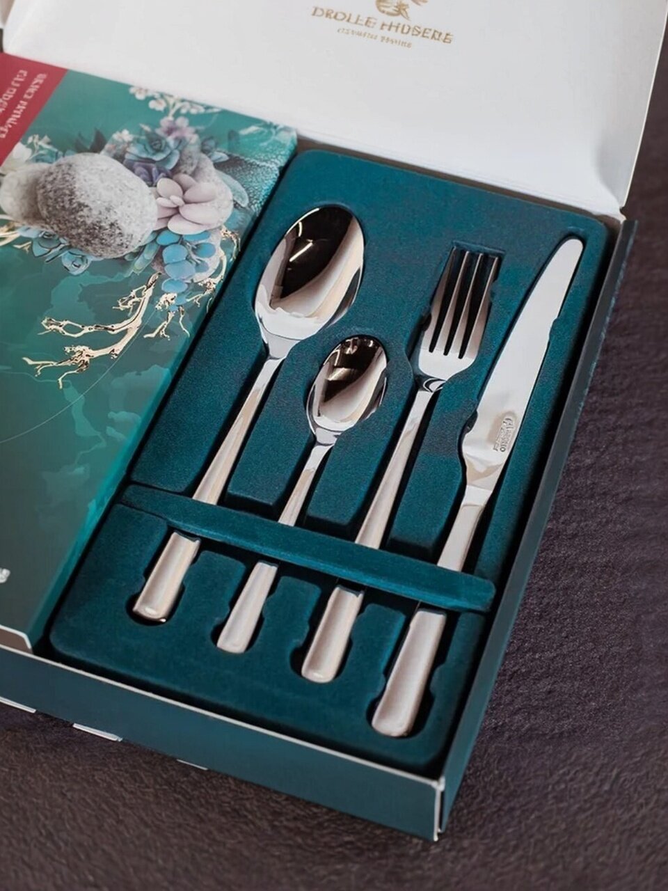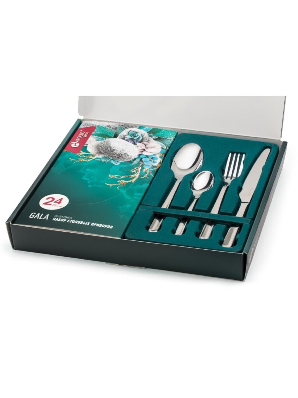 Если вы не знаете, что лучше выбрать для подарка на 6 персон, обратите внимание на этот набор: 24 предмета в подарочной упаковке — решение для семьи, пары или коллег. Благодаря универсальному назначению (столовые и чайные приборы), Gala GAL-24 подходит для ежедневных трапез и праздничных мероприятий. Компактная коробка облегчает хранение и транспортировку, что удобно для дачи или пикника.