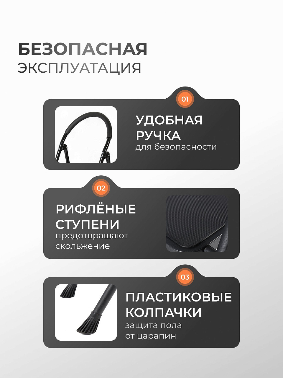 Стремянка изготовлена из высококачественных материалов, что обеспечивает ее долговечность и устойчивость.