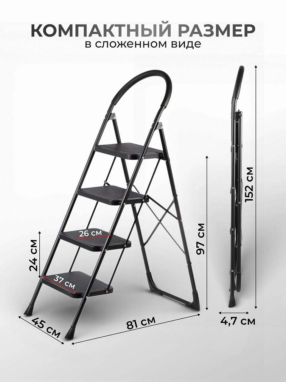 В сложенном виде стремянка занимает мало места. Это делает ее удобной для хранения как в домашних условиях, так и в профессиональной среде, где пространство также может быть ограничено.