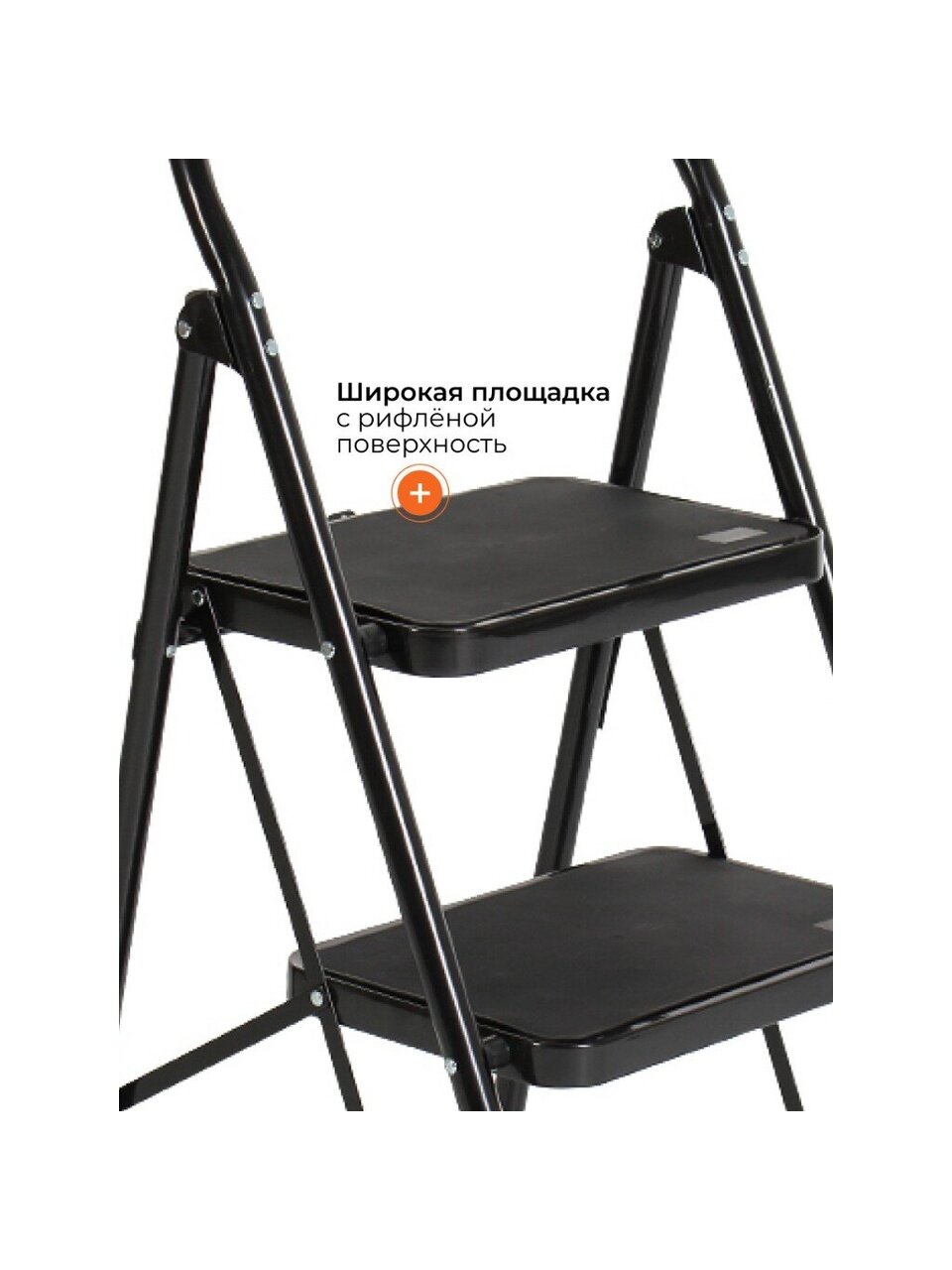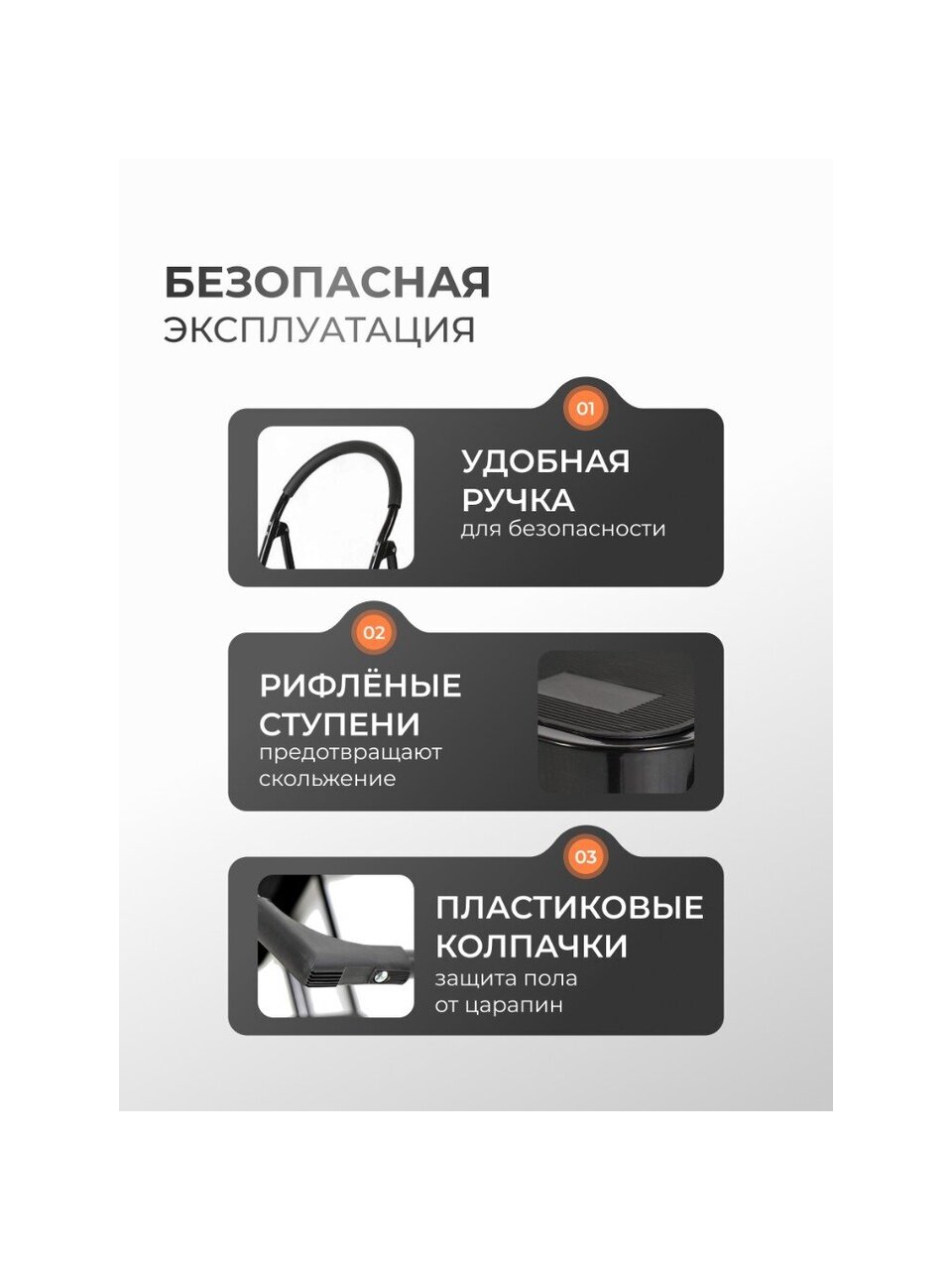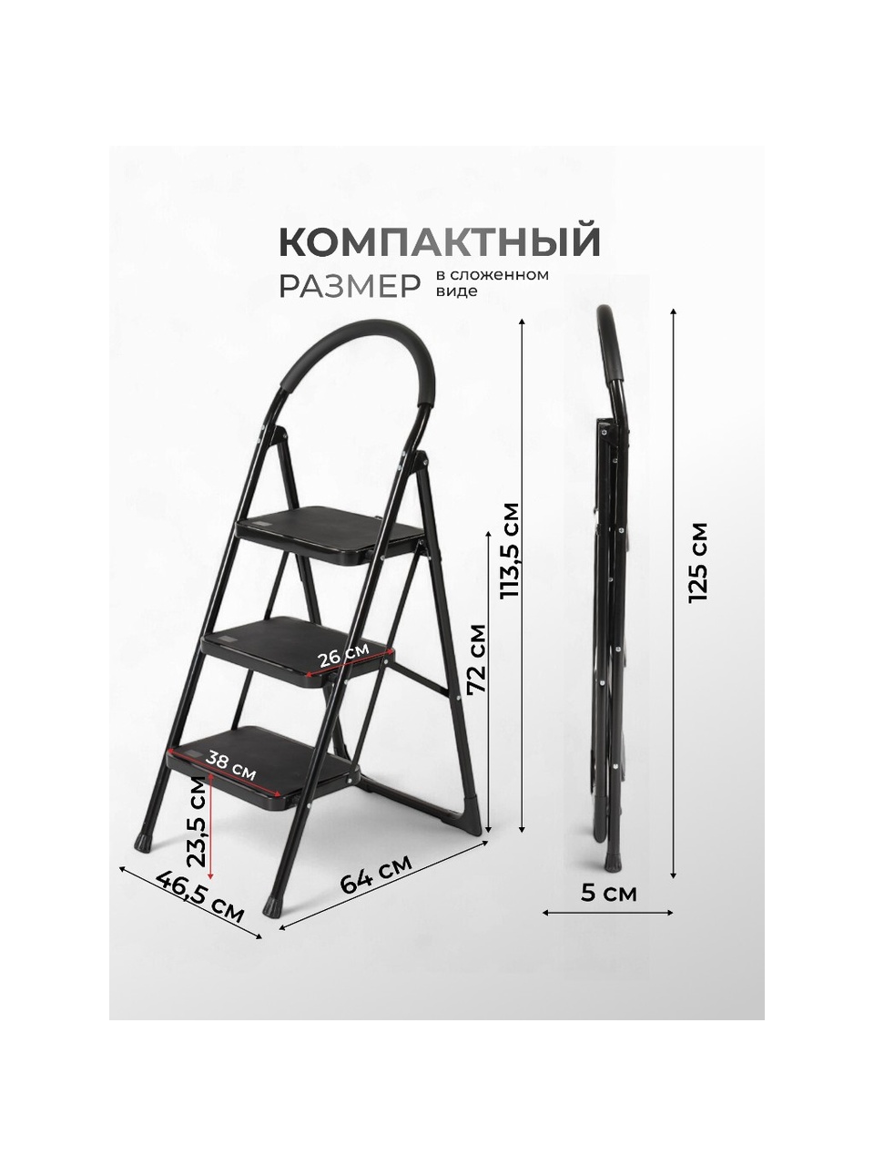 Стремянка изготовлена из высококачественной стали, что гарантирует устойчивость к износу и механическим повреждениям. Лаконичный дизайн и нейтральный цвет позволяют использовать стремянку в любом интерьере, не нарушая гармонию пространства. Размеры 115х64х45.5 см обеспечивают комфортную высоту для выполнения большинства бытовых задач, будь то замена лампочки, уборка на верхних полках или проведение мелкого ремонта.