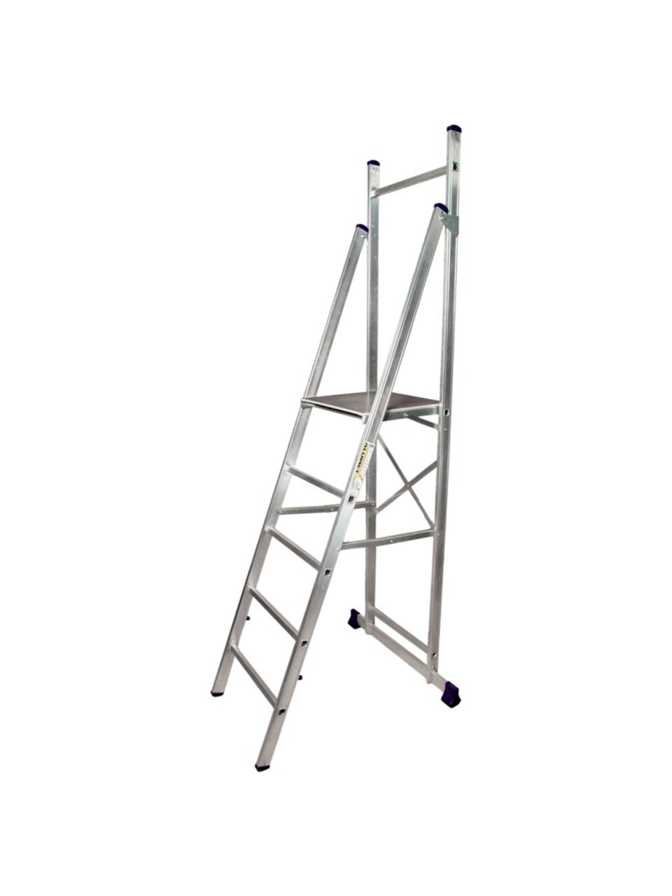 Стремянка-помост представляет собой свободностоящую переносную лестницу, имеющую сторону подъема (переднюю ногу), опорную сторону (заднюю ногу), рабочую площадку и раскладывающуюся для подъема на высоту. В верхней части задней ноги стремянки имеется поперечина, которая выполняет роль перила и обеспечивает безопасность при работе. Для жесткости на задней ноге имеются диагонали. На задней ноге внизу находится стабилизатор без колес. Задняя и передняя ноги соединены между собой. Стремянка в рабочем положении надежно фиксируется рабочей площадкой и страховочными складывающимися металлическими стяжками. Рабочая площадка выполнена из влагостойкой ламинированной нескользящей фанеры, которая крепится на стальные уголки. Тетивы и ступени стремянки изготовлены из высокопрочного алюминиевого профиля. Ступени имеют рифленую поверхность. Массивные башмаки изготовлены из высокопрочного обрезиненного пластика.