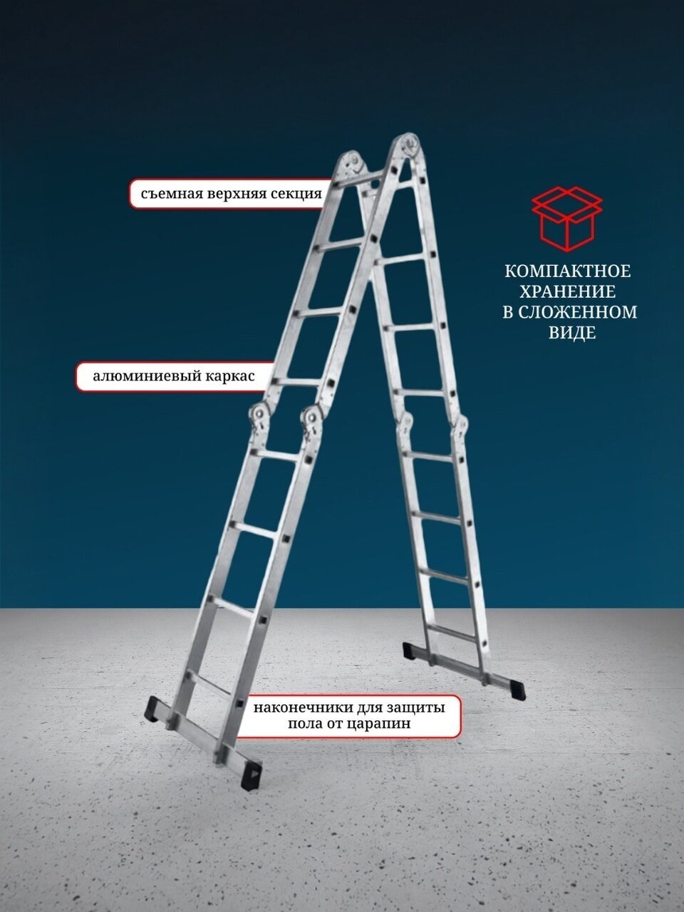 Лестница-трансформер — это шарнирная лестница состоящая из отдельных секций, соединенных между собой шарнирными замками. Каждый шарнир позволяет фиксировать различный угол между секциями. Это позволяет использовать лестницу-трансформер во многих модификациях: приставная лестница, стремянка, помост, консольная лестница и многое другое. Шарнирная лестница может складываться в 4 раза, что придает ей очень компактные размеры. При одинаковой длине в приставном виде шарнирная лестница в сложенном виде будет всегда намного компактней, чем трехсекционная универсальная лестница. Даже самая большая лестница-трансформер влезает в багажник легкового автомобиля.