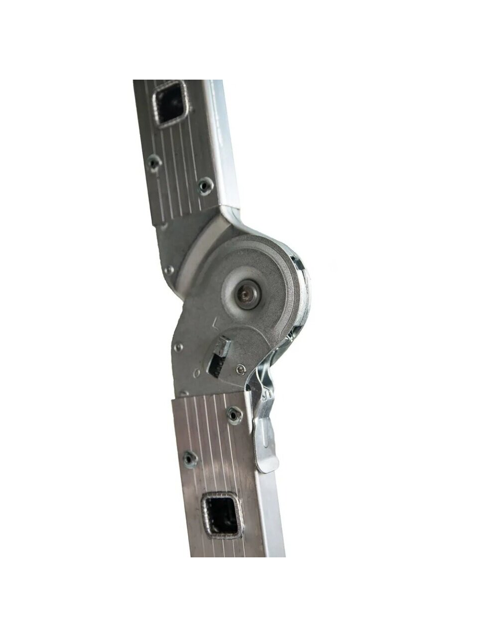 - Шарнирное стальное соединение повышенной прочности. Даёт возможность принимать разные позиции и надёжно фиксировать лестницу.