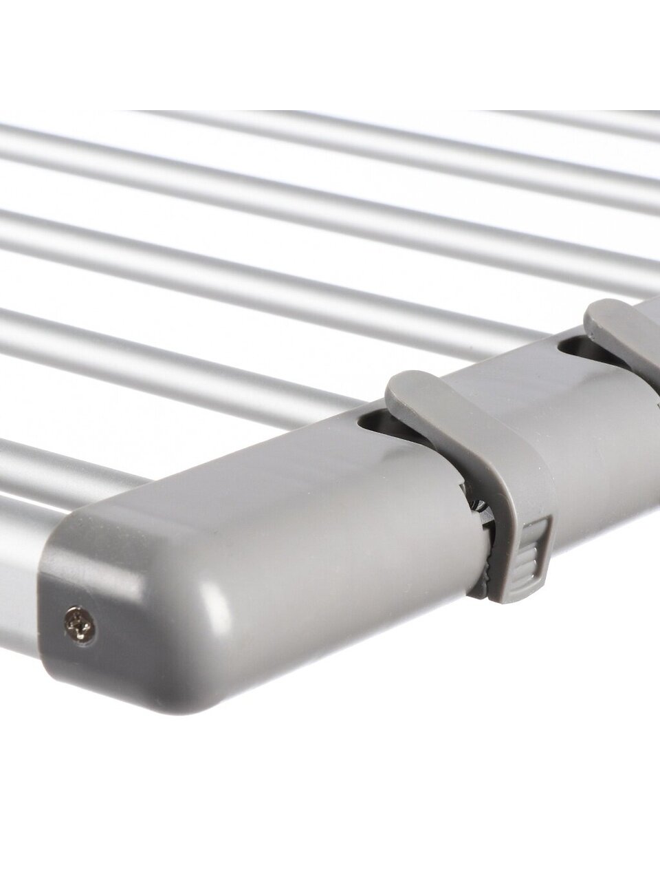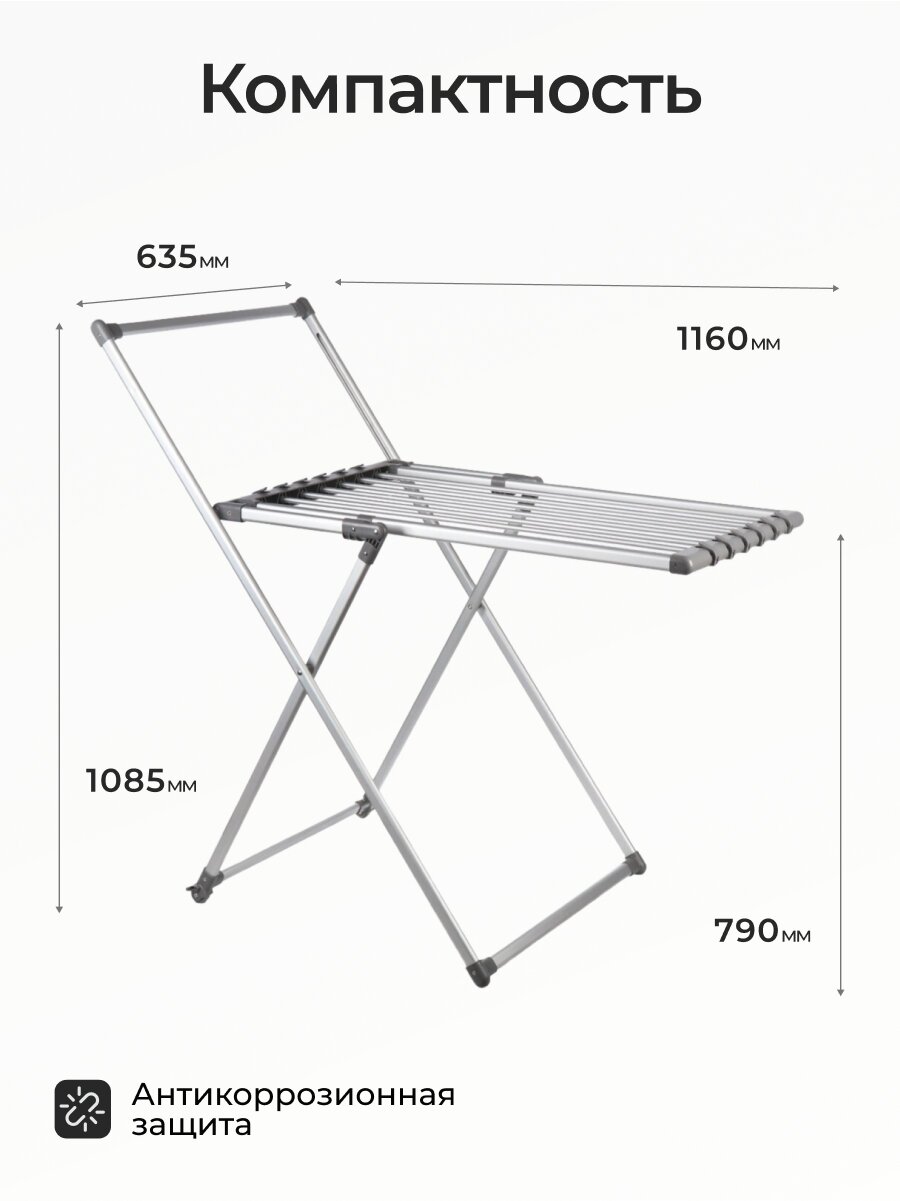 На замену громоздким сушилкам для белья приходят современные и функциональные модели. Компактная складная конструкция сушилки 126208C позволяет использовать ее даже в небольшом пространстве. Легкое изделие из алюминия с антикоррозийным покрытием гарантирует комфортную и длительную эксплуатацию.