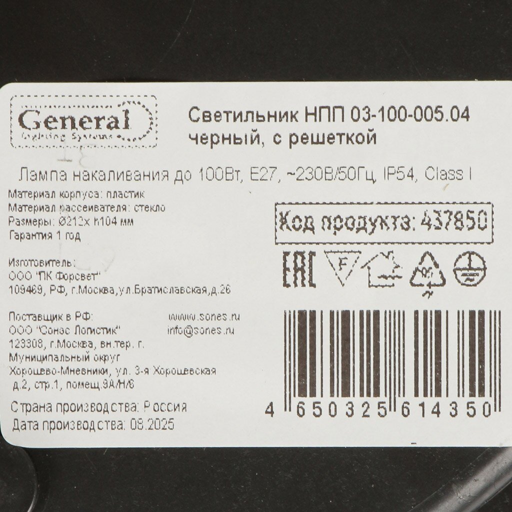 Светильник General НПП 03-100-005.04 черный с решеткой — надежное освещение для дома и дачи: защита IP54, прочное стекло, монтаж за 10 минут.