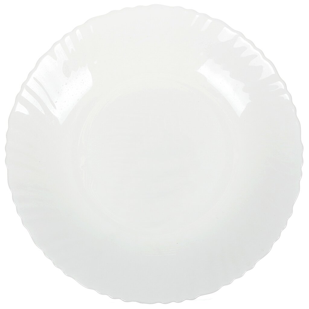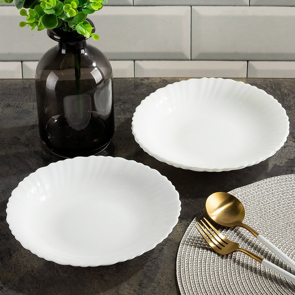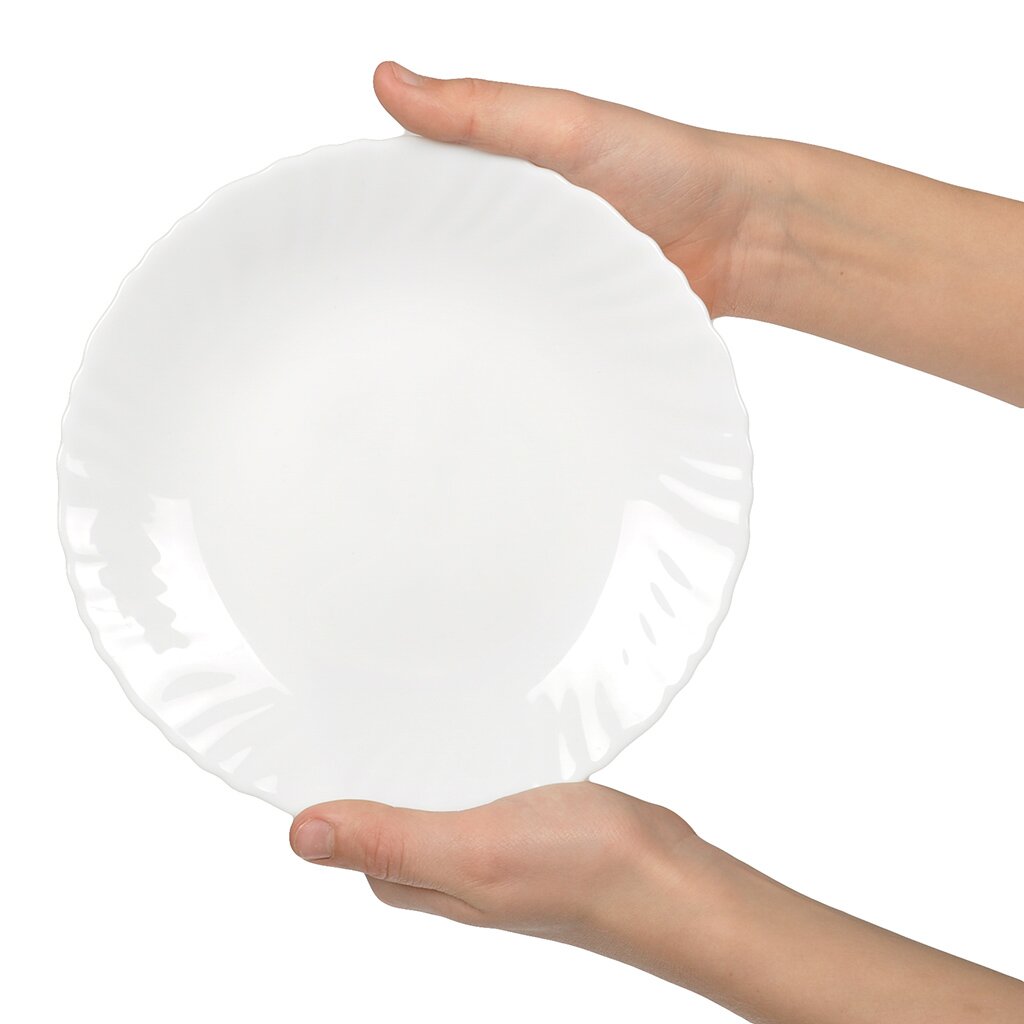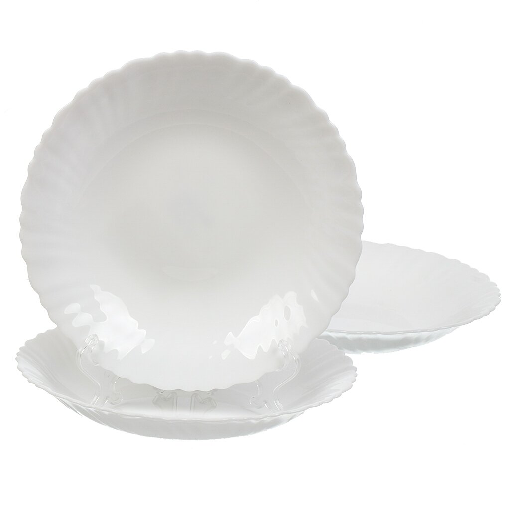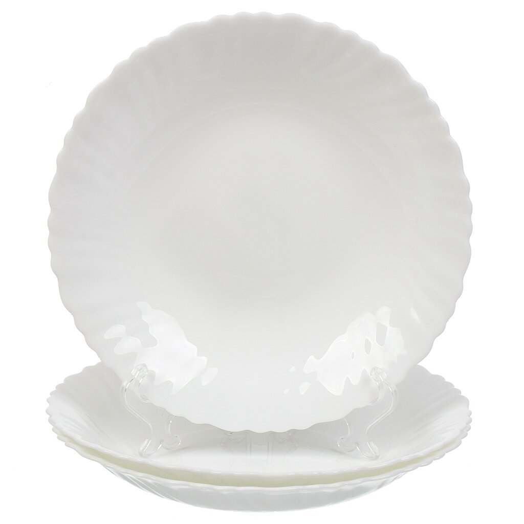 Каждая тарелка рассчитана на 620 мл, диаметр — 21.5 см, форма круглая, цвет — белый, в наборе 3 штуки.