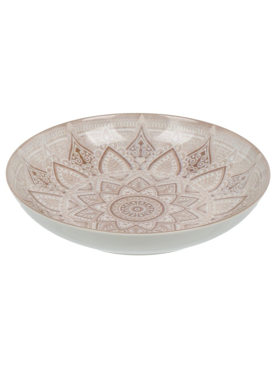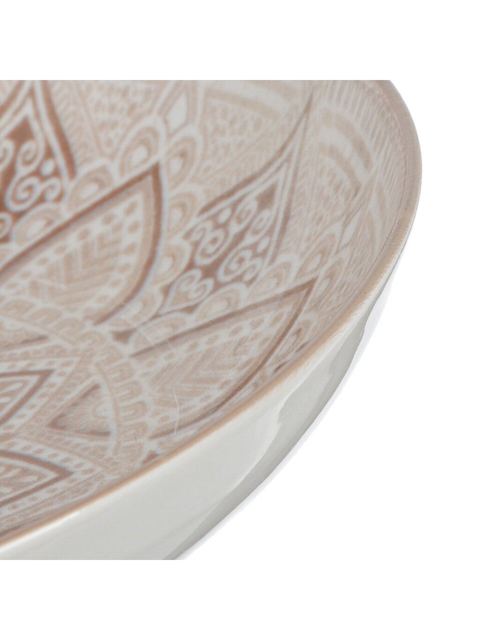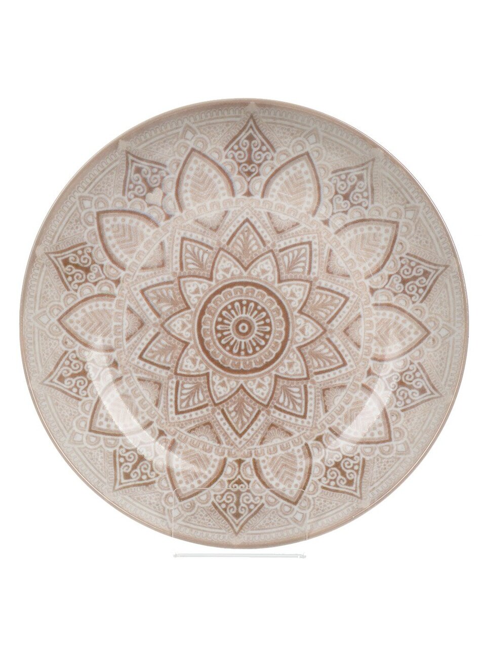 Тарелка выполнена из прочного фарфора с изящным узором в бежевых тонах. Материал не впитывает запахи и долго сохраняет презентабельный внешний вид.