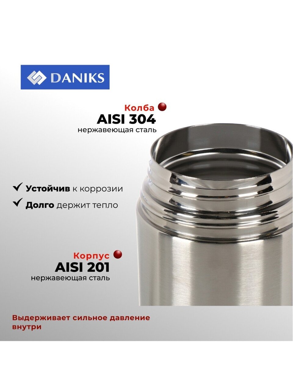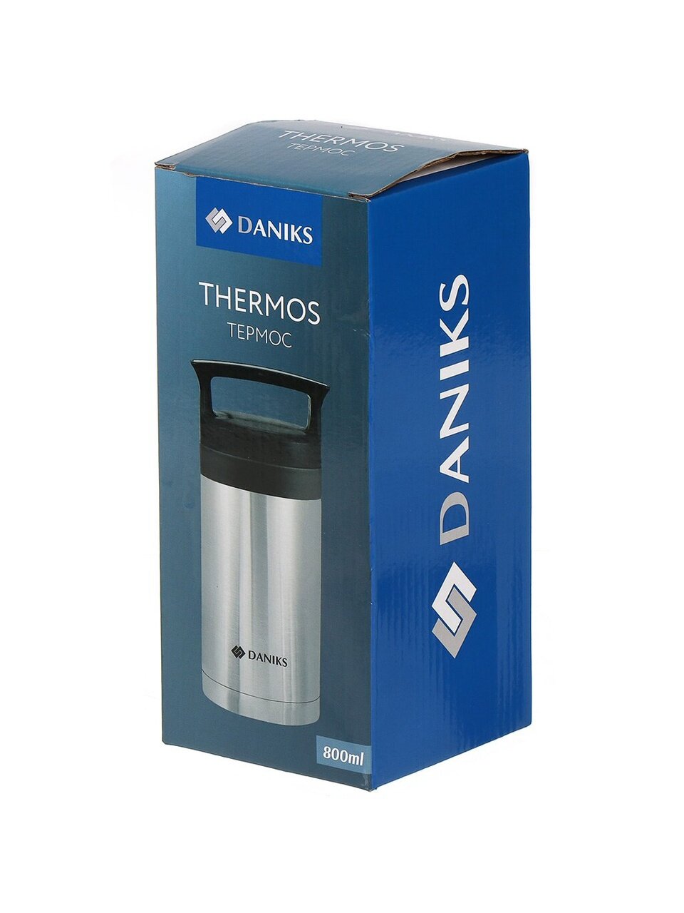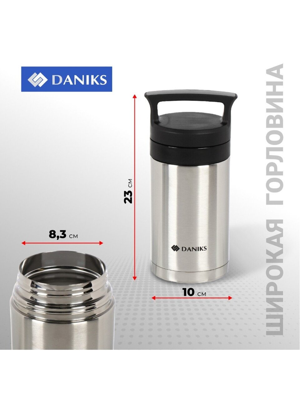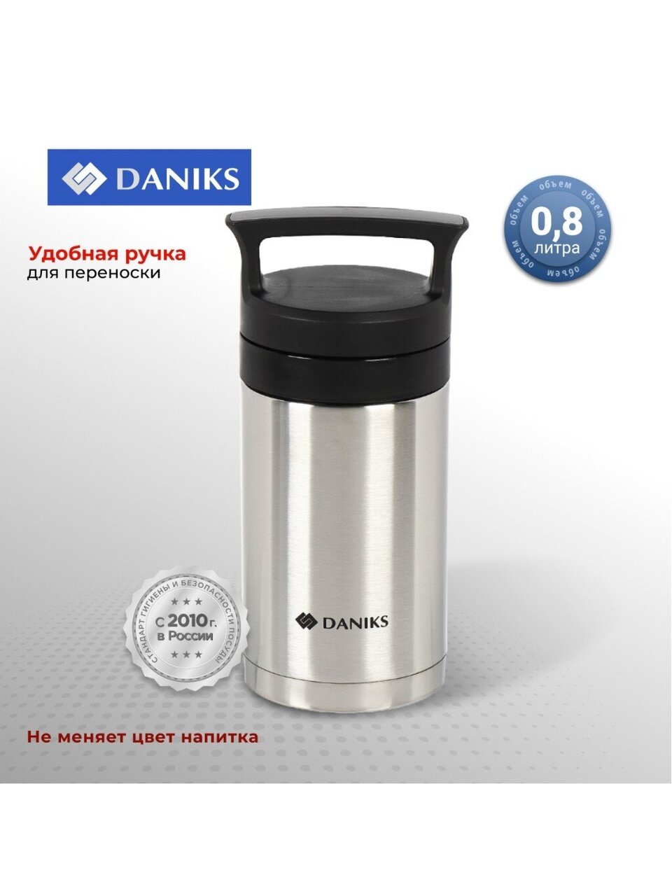 Термос Daniks 0.8 л сохраняет температуру горячих и холодных блюд до 24 часов за счет двойных стенок из нержавеющей стали и герметичной крышки.