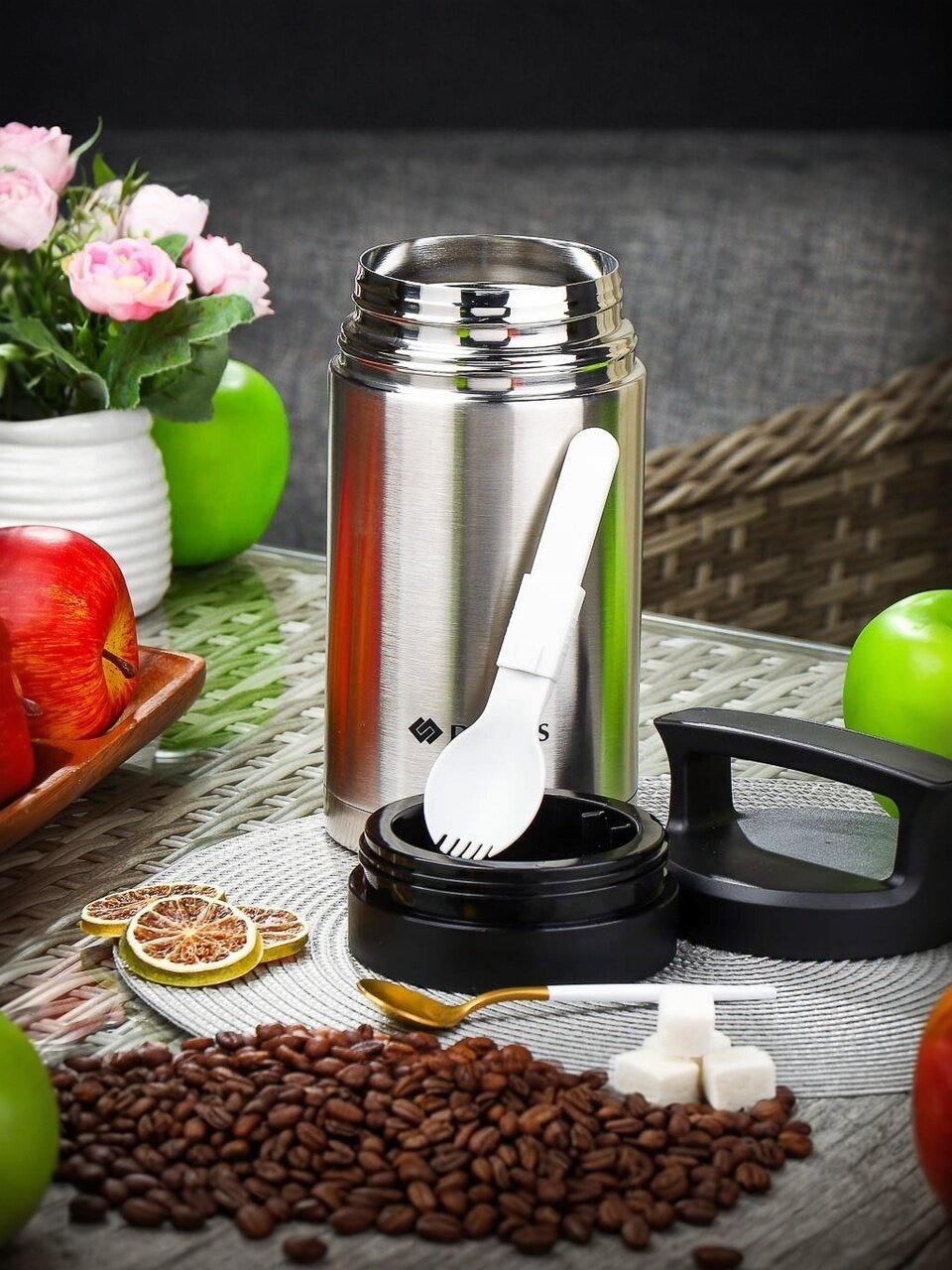 Термос для еды Daniks 0.8 л с ложкой: держит тепло 24 часа, нержавеющая сталь, идеален для похода, работы и автомобиля.